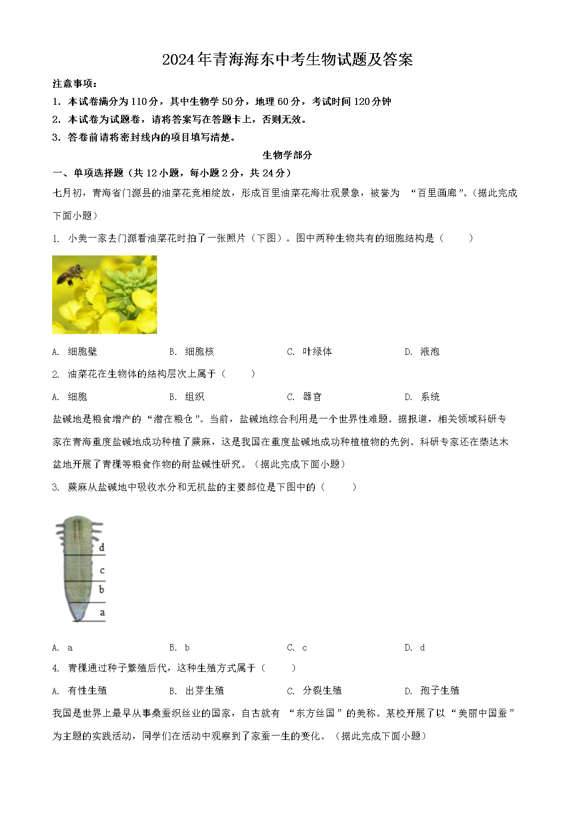 【文档名称】 2024年青海海东中考生物试题及答案(Word版).doc