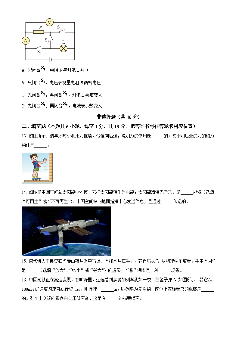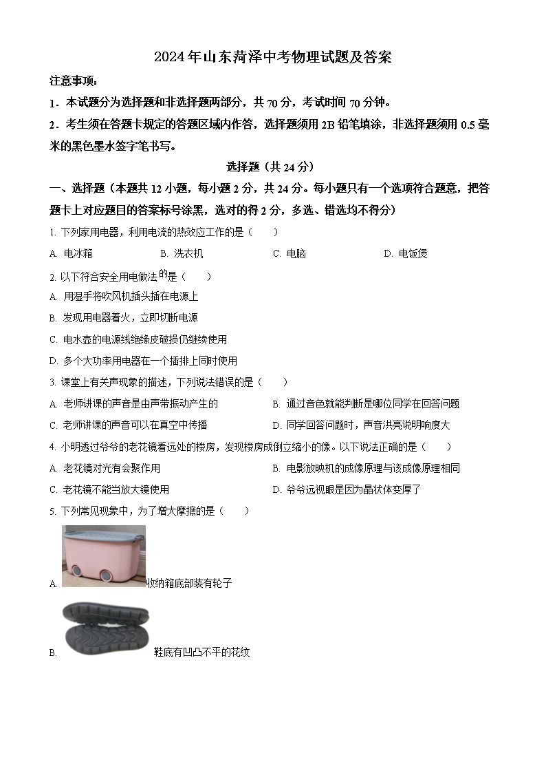 【文档名称】 2024年山东菏泽中考物理试题及答案(Word版).doc