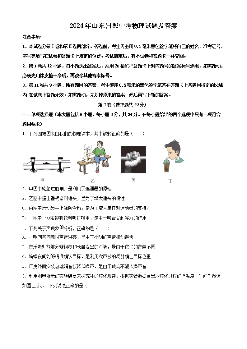 【文档名称】 2024年山东日照中考物理试题及答案(Word版).doc