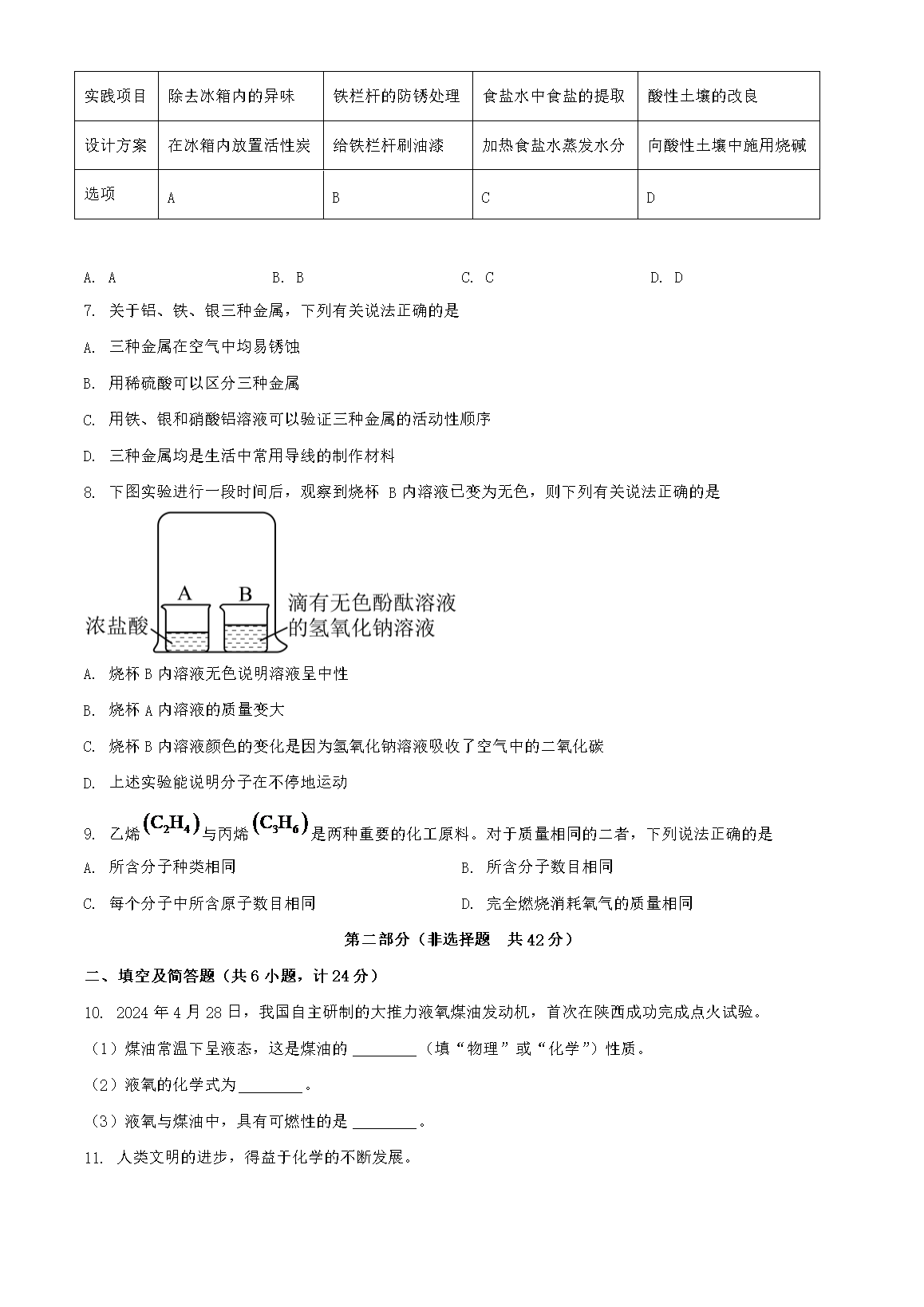 【文档名称】 2024年陕西汉中中考化学试题及答案(Word版).doc