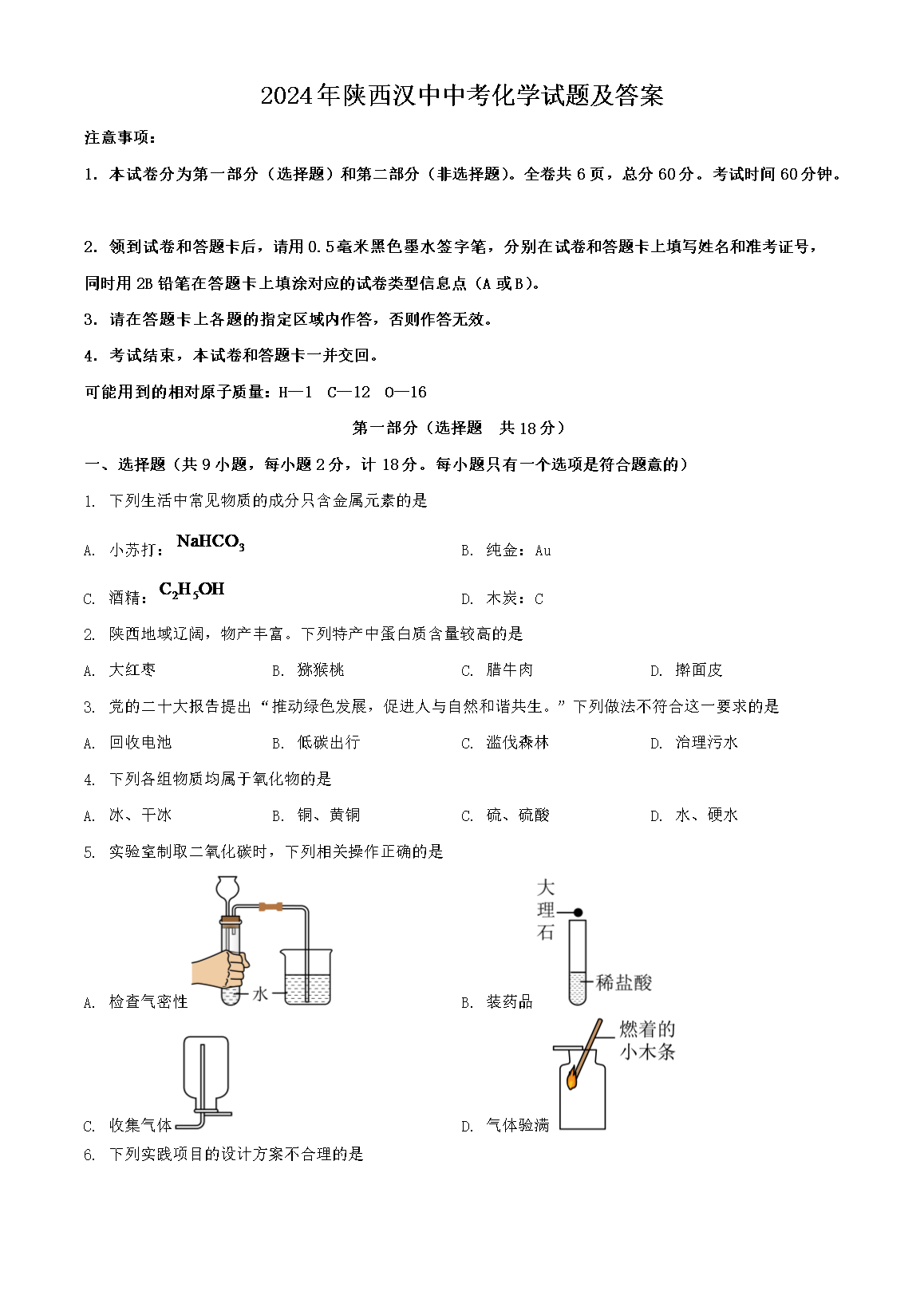 【文档预览】 无忧考网整理发布2024年陕西汉中中考化学试题及答案(Word版),前五页预览如下: