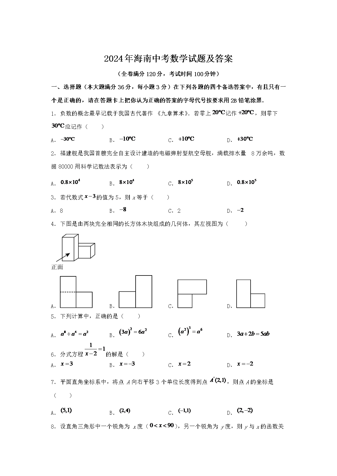 【文档名称】 2024年海南中考数学试题及答案(Word版).doc
