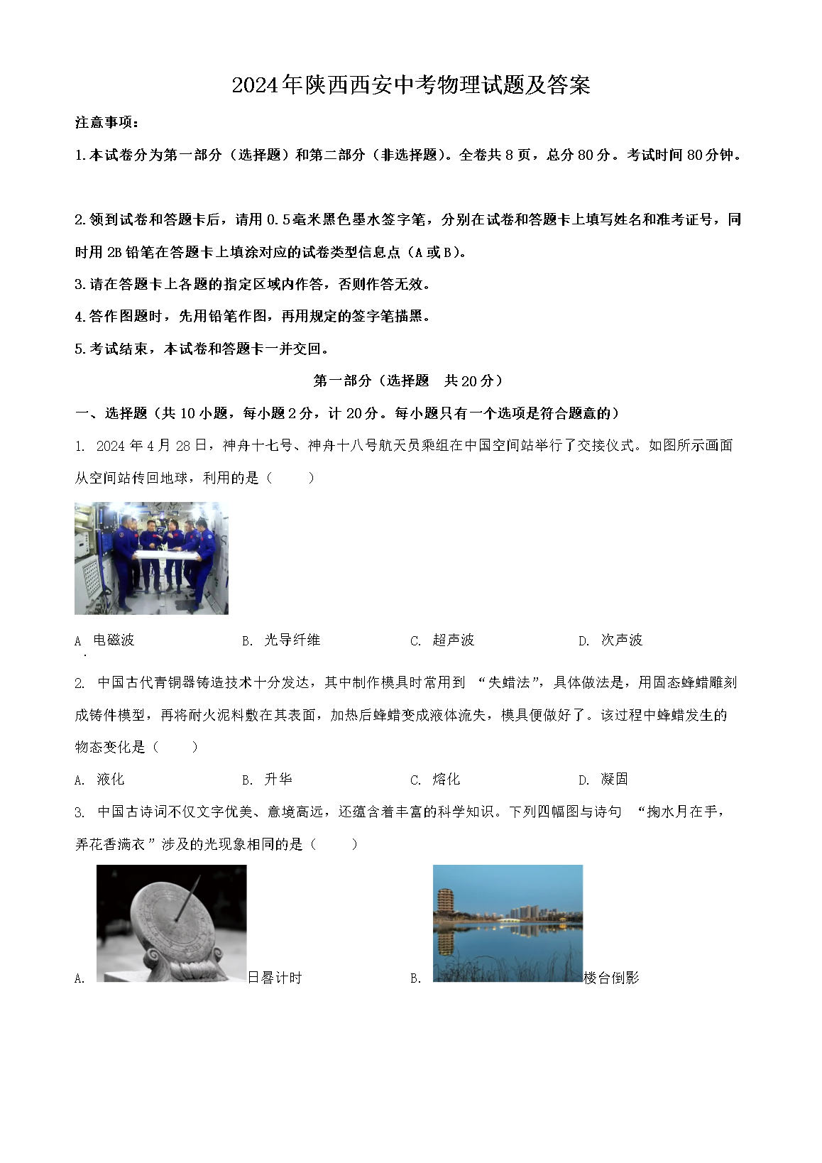 【文档名称】 2024年陕西西安中考物理试题及答案(Word版).doc