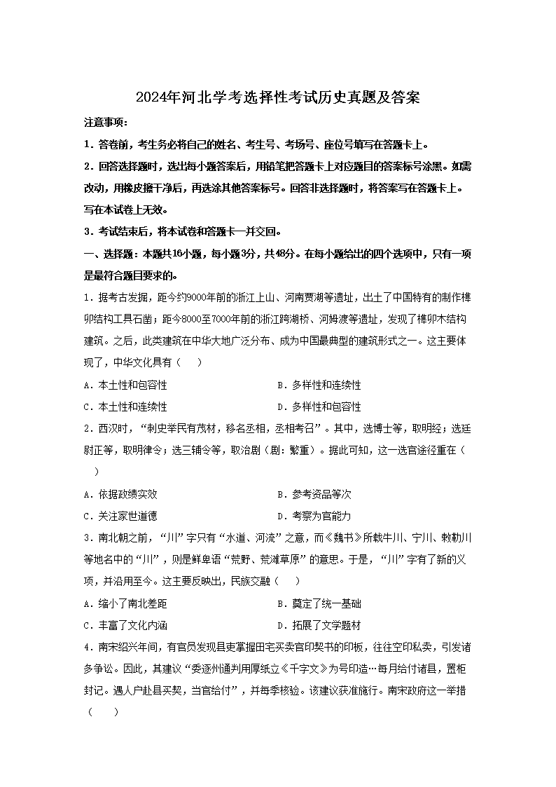 【文档名称】 2024年河北学考选择性考试历史真题及答案(Word版).doc