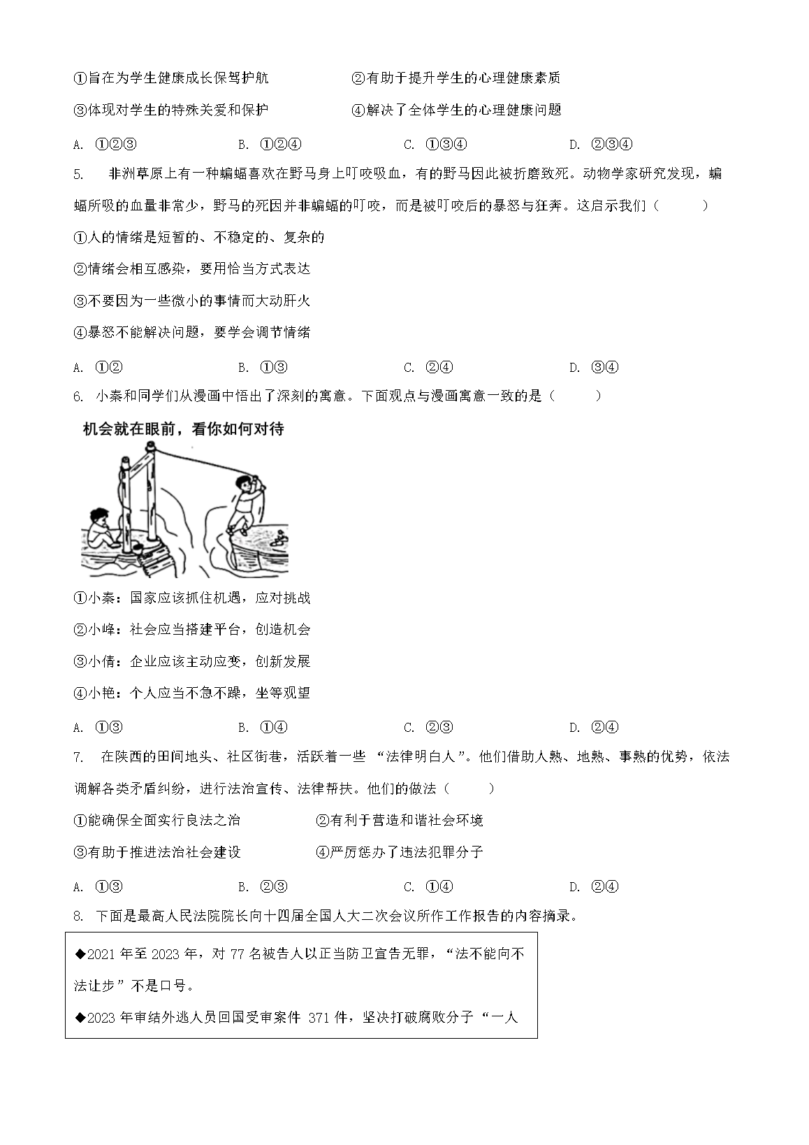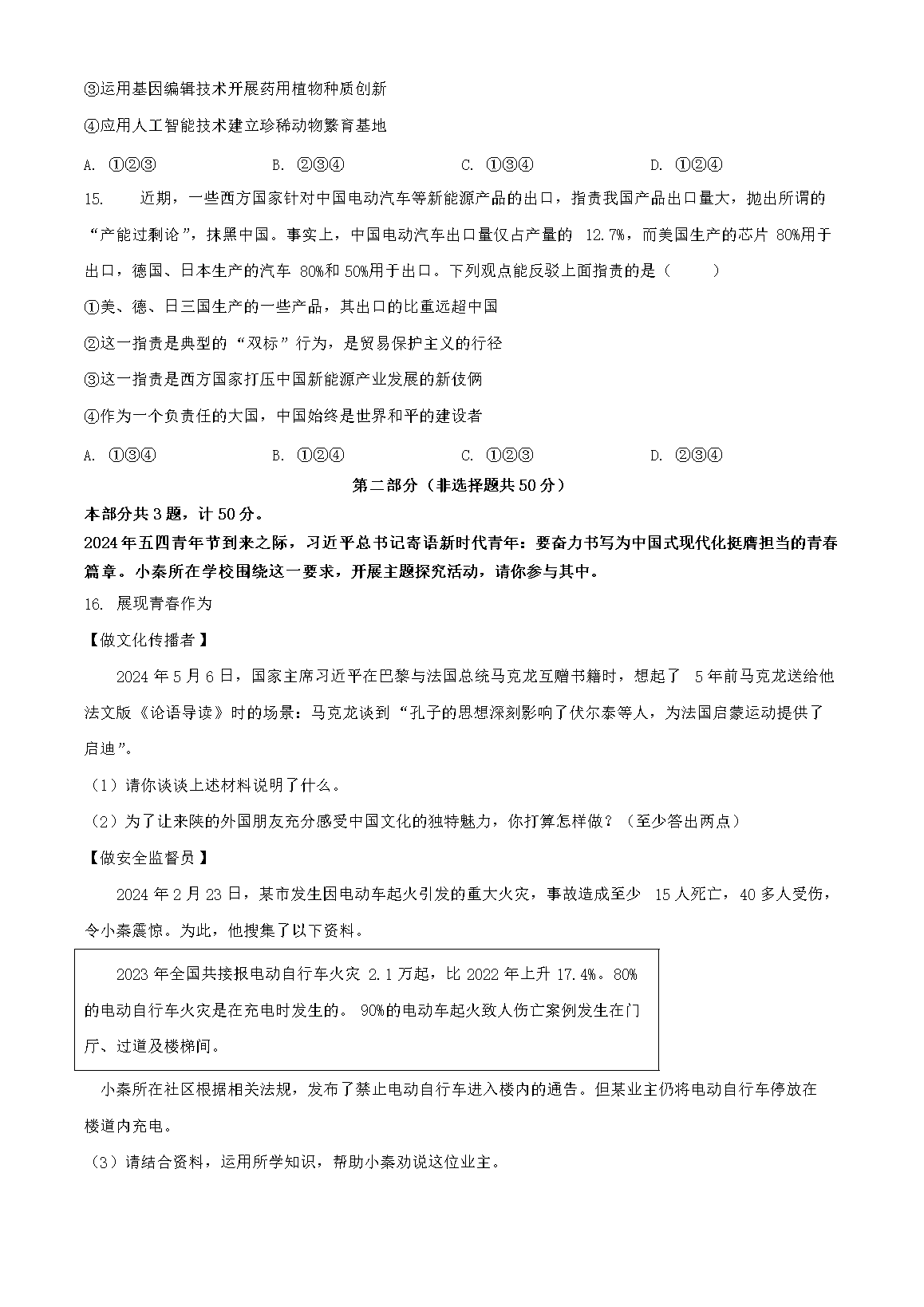 【文档名称】 2024年陕西西安中考道德与法治试题及答案(Word版).doc