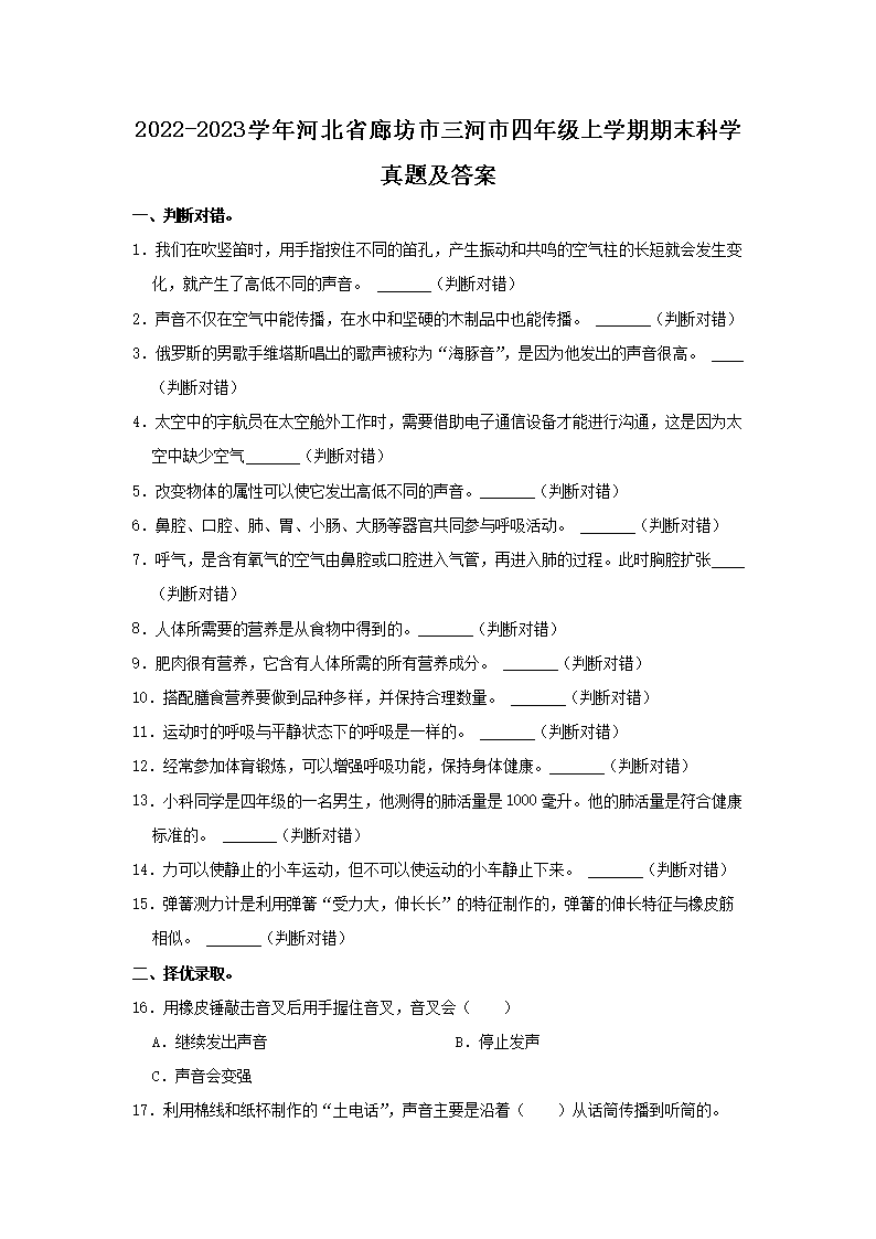 【文档名称】 2022-2023学年河北省廊坊市三河市四年级上学期期末科学真题及答案(Word版).doc