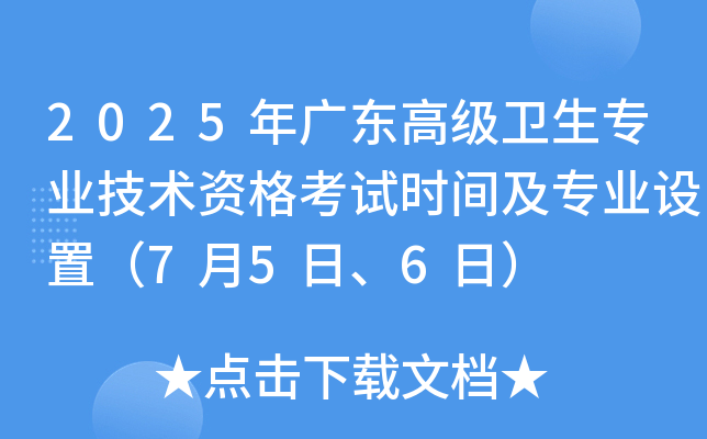 【#卫生职称考试# #2025年广东高级卫生专业技术资格考试时间及专业设置(7月5日、6日)#】®无忧考网从广东省卫生健康委员会发布的《2025年广东高级卫生专业技术资格考试工作的通知》得知,2025年广东高级卫生专业技术资格考试时间及专业设置已公布,7月5日、6日举行考试,6月30日至7月4日打印准考证,具体详情如下: