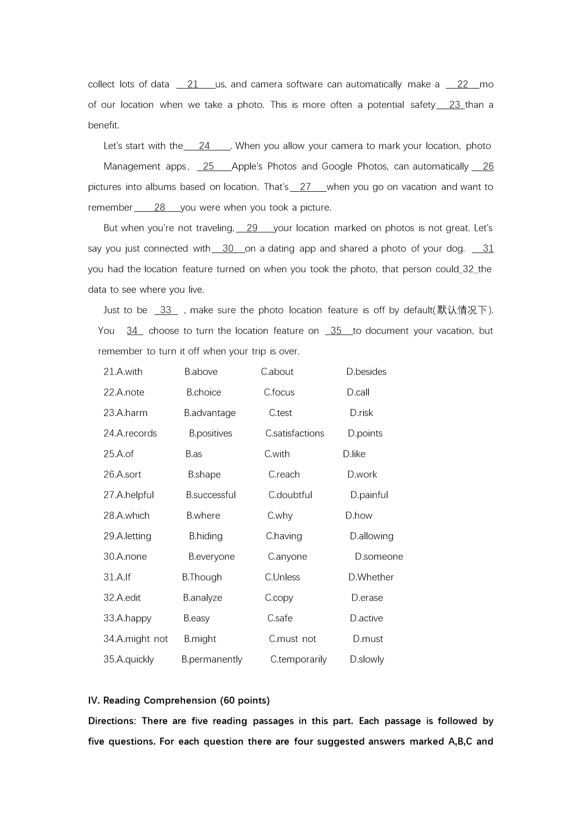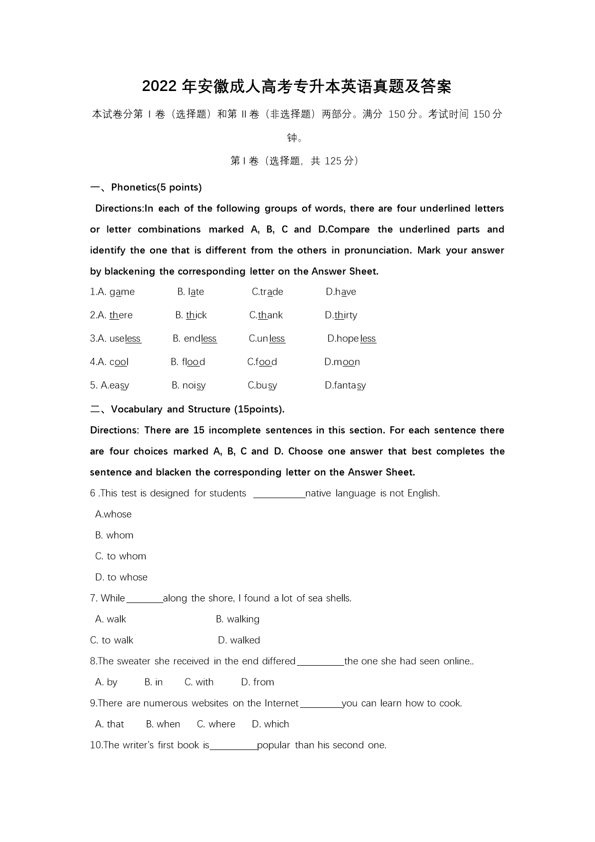 【文档预览】 无忧考网整理发布2022年安徽成人高考专升本英语真题及答案(Word版),前五页预览如下: