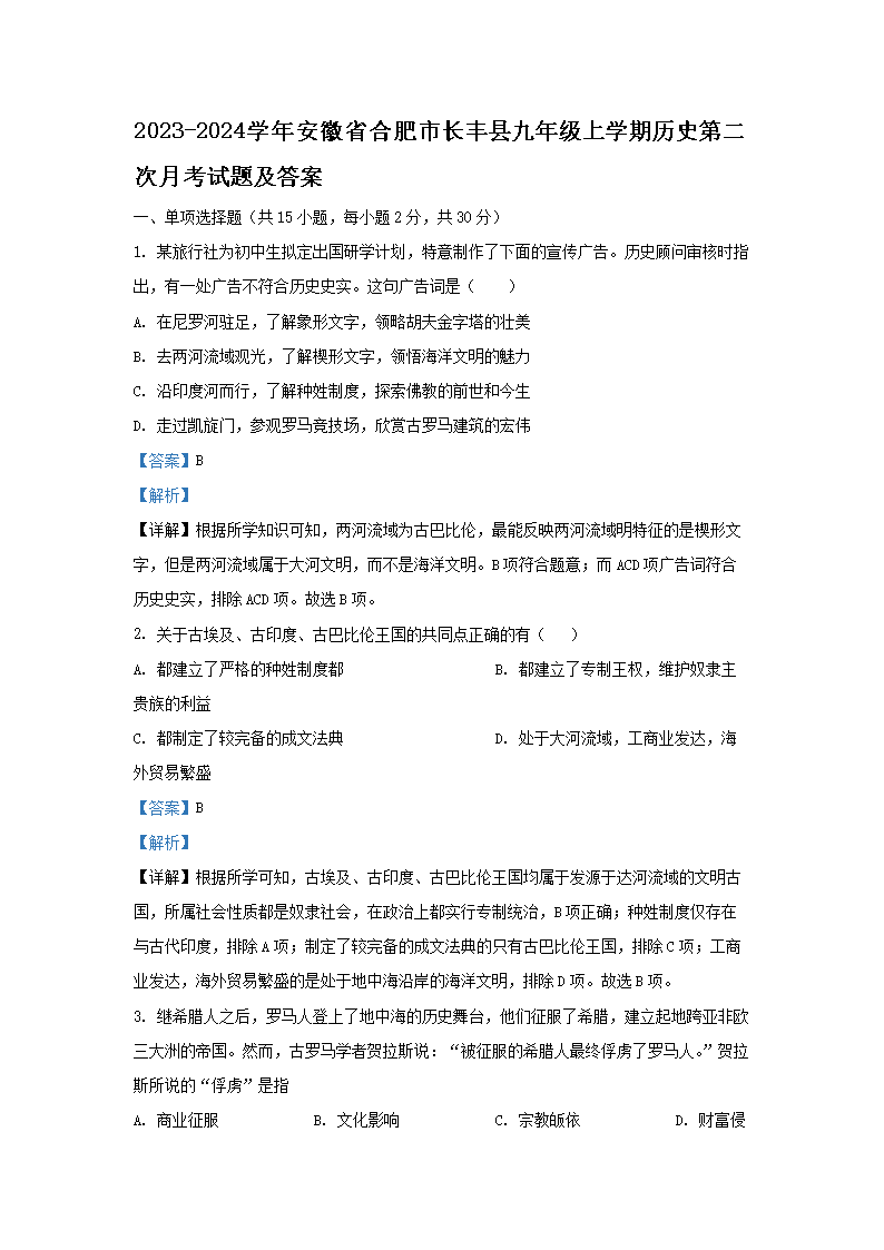 【文档名称】 2023-2024学年安徽省合肥市长丰县九年级上学期历史第二次月考试题及答案(Word版).doc