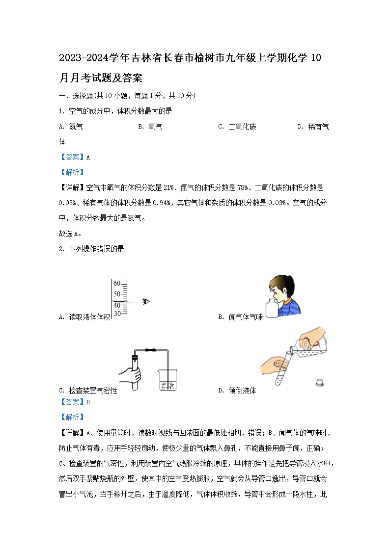 【文档预览】 无忧考网整理发布2023-2024学年吉林省长春市榆树市九年级上学期化学10月月考试题及答案(Word版),前五页预览如下: