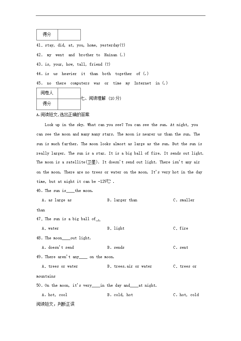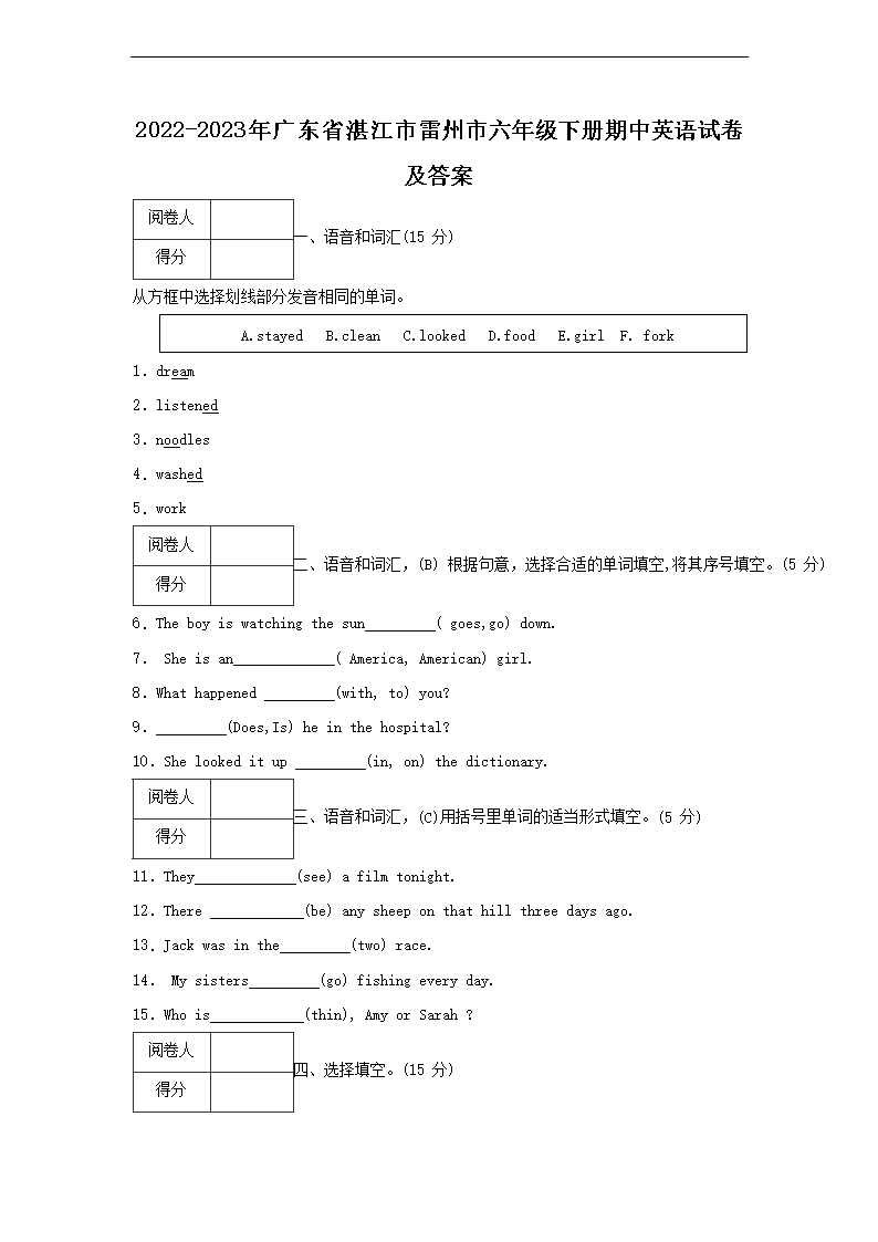【文档预览】 无忧考网整理发布2022-2023年广东省湛江市雷州市六年级下册期中英语试卷及答案(Word版),前五页预览如下: