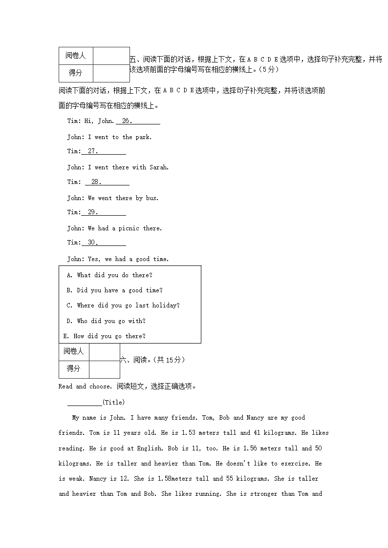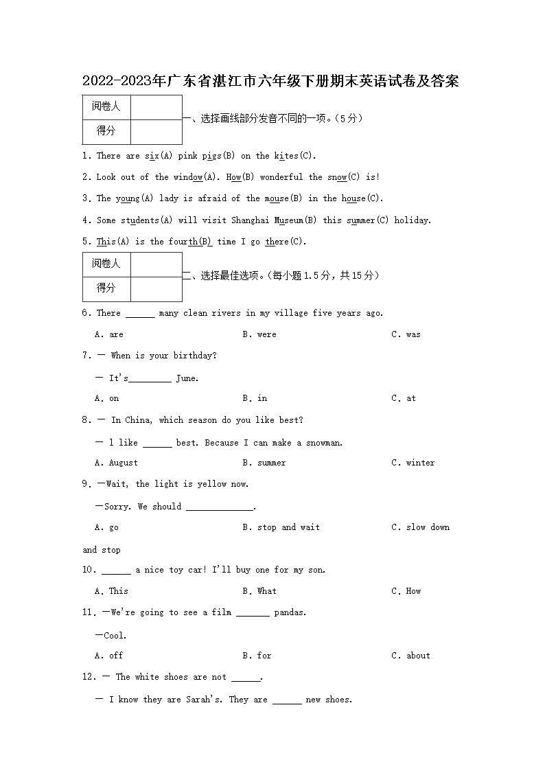 【文档预览】 无忧考网整理发布2022-2023年广东省湛江市六年级下册期末英语试卷及答案(Word版),前五页预览如下: