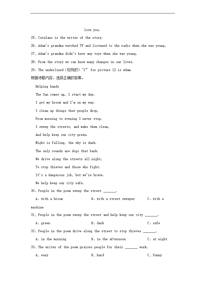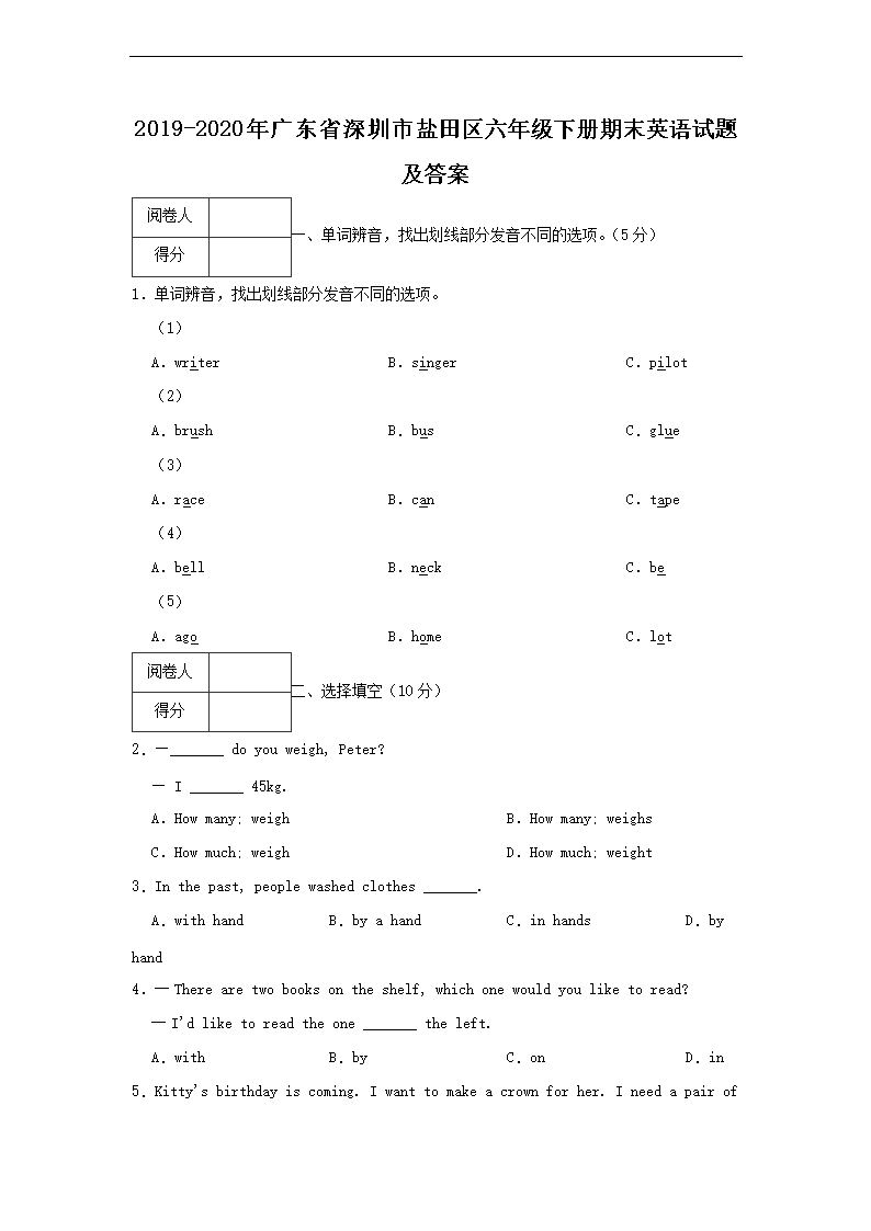 【文档名称】 2019-2020年广东省深圳市盐田区六年级下册期末英语试题及答案(Word版).doc