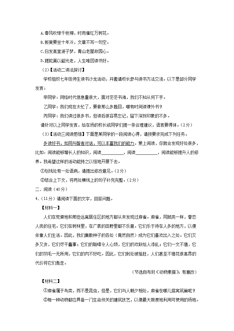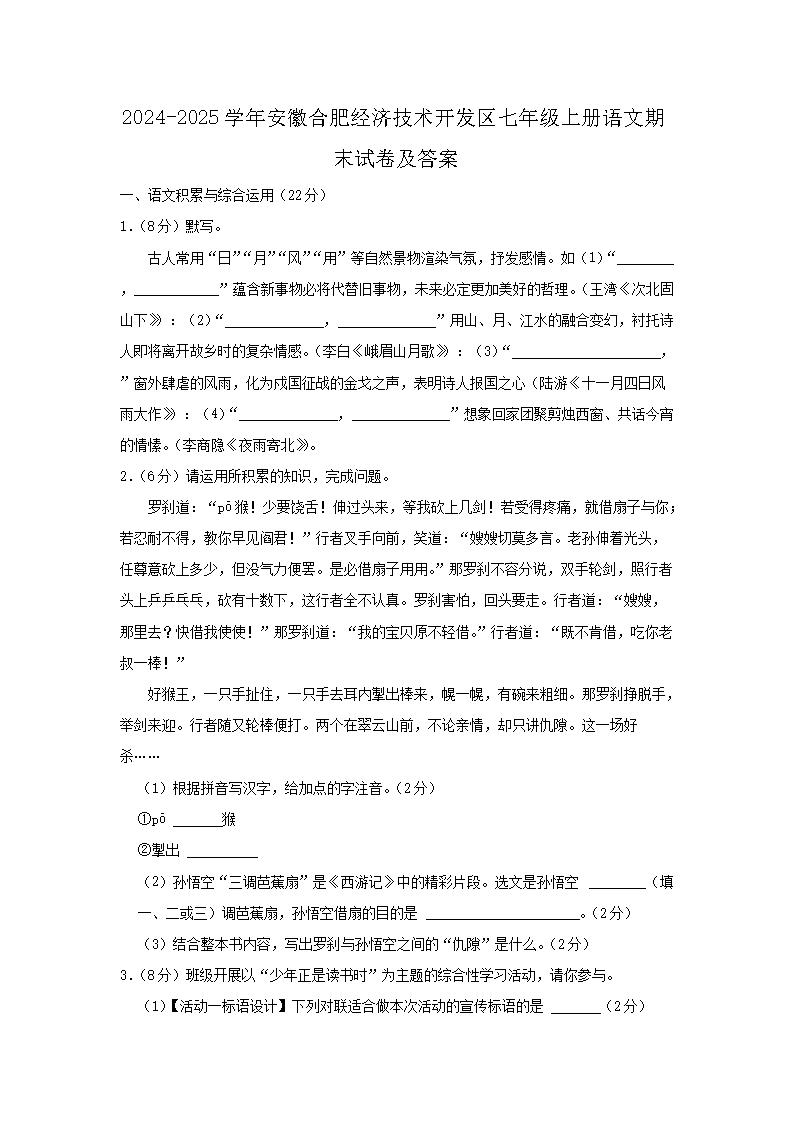 【文档名称】 2024-2025学年安徽合肥经济技术开发区七年级上册语文期末试卷及答案(Word版).doc