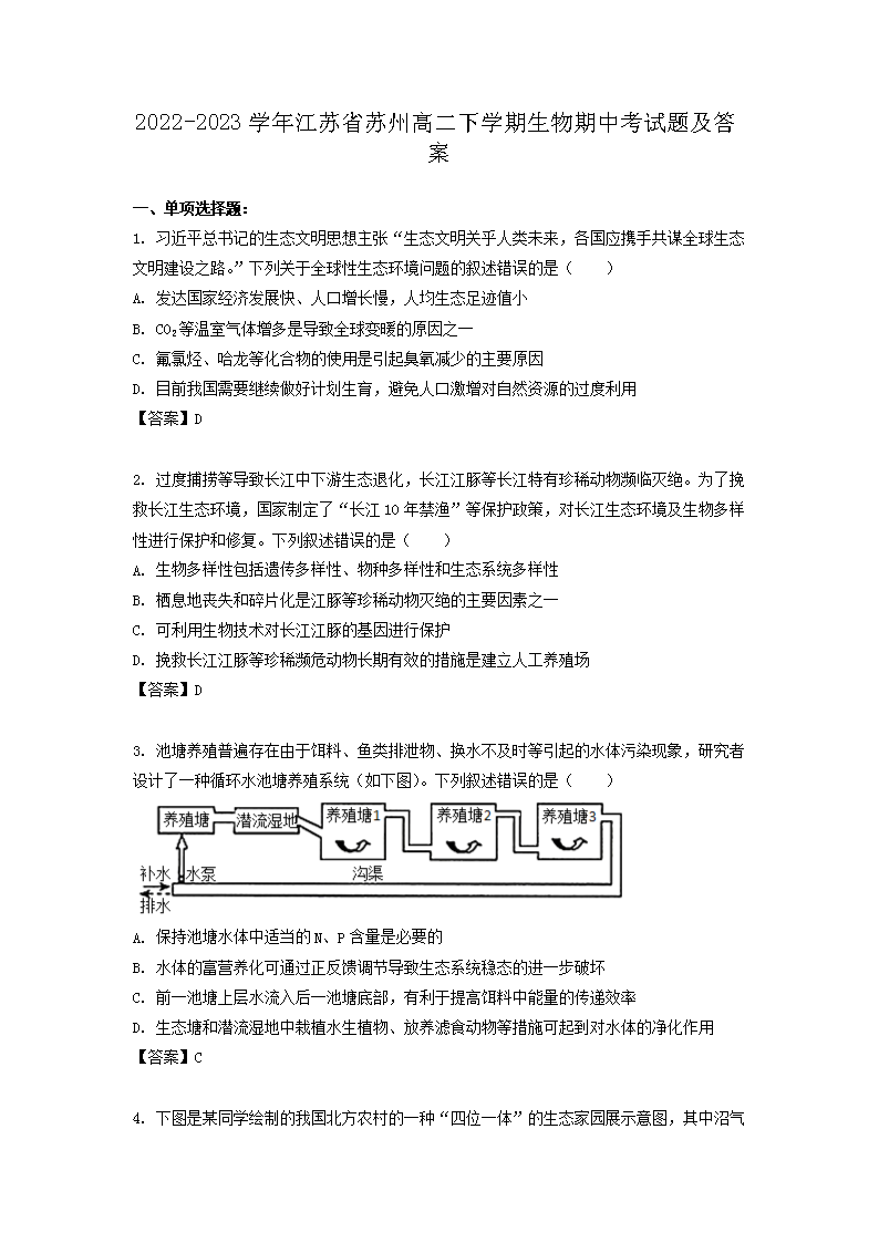 【文档预览】 无忧考网整理发布2022-2023学年江苏省苏州高二下学期生物期中考试题及答案(Word版),前五页预览如下: