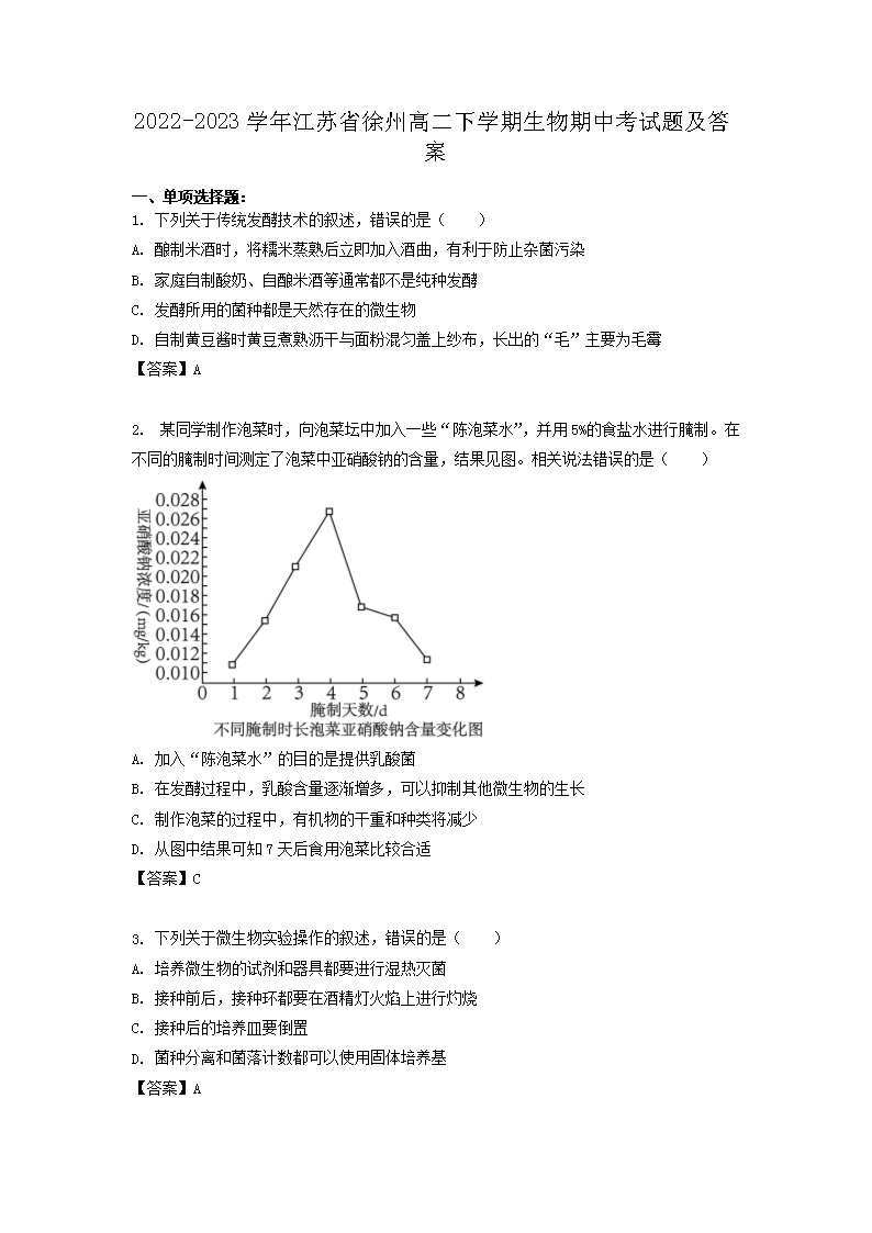 【文档预览】 无忧考网整理发布2022-2023学年江苏省徐州高二下学期生物期中考试题及答案(Word版),前五页预览如下: