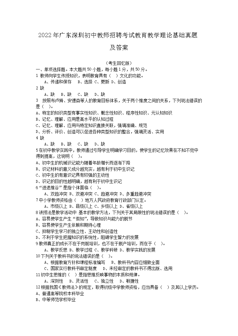 【文档名称】 2022年广东深圳初中教师招聘考试教育教学理论基础真题及答案(Word版).doc