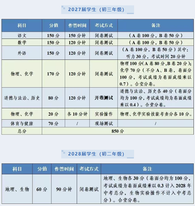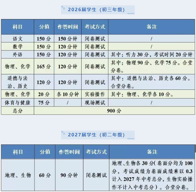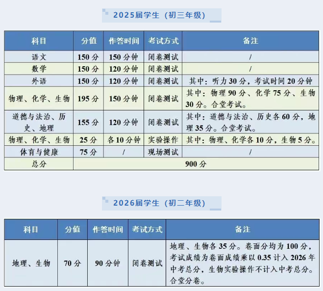 均以纸笔闭卷考试形式进行,采用合堂分卷形式进行命题,卷面分均为100分,考试成绩为卷面成绩乘以0.35计入2026年中考总分,生物实验操作不计入中考总分。