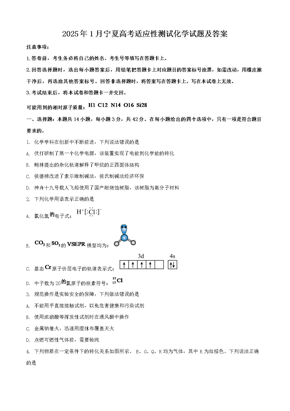 【文档名称】 2025年1月宁夏高考适应性测试化学试题及答案(Word版).doc