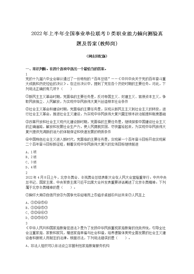 【文档名称】 2022年上半年全国事业单位联考D类职业能力倾向测验真题及答案(教师岗)(Word版).doc