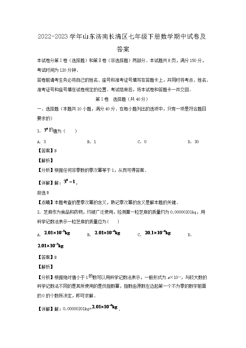 【文档预览】 无忧考网整理发布2022-2023学年山东济南长清区七年级下册数学期中试卷及答案(Word版),前五页预览如下: