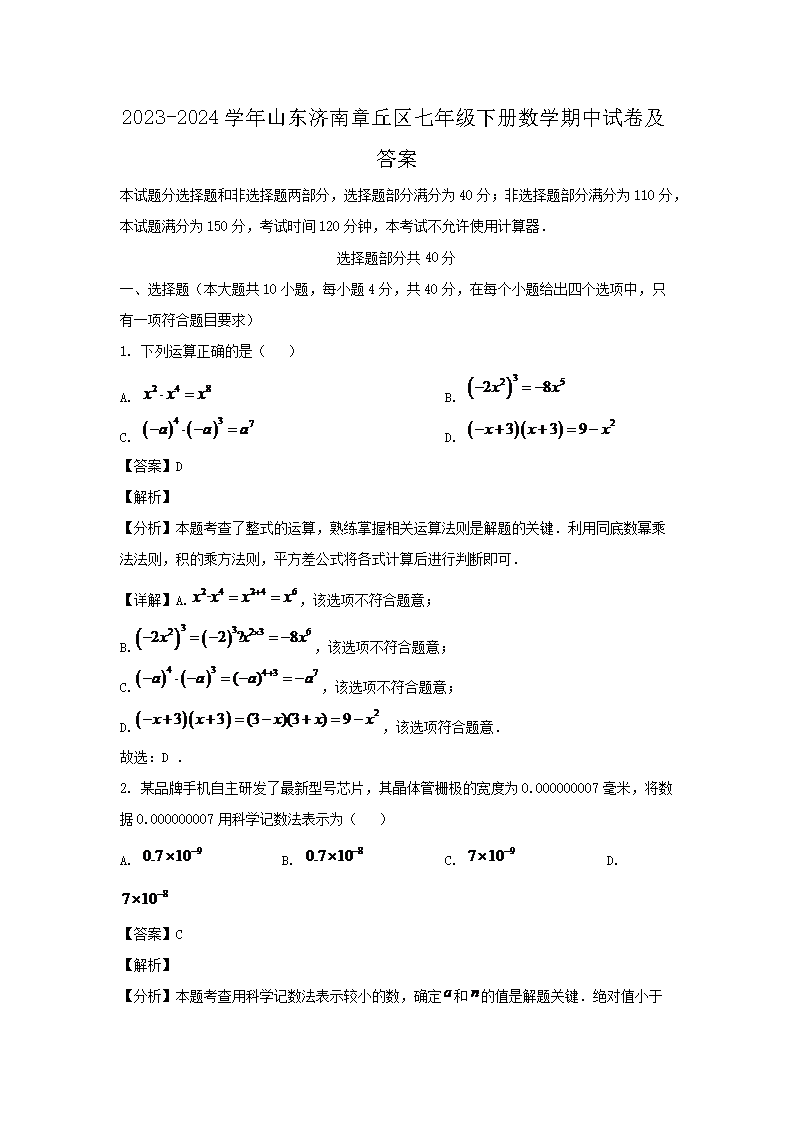 【文档预览】 无忧考网整理发布2023-2024学年山东济南章丘区七年级下册数学期中试卷及答案(Word版),前五页预览如下: