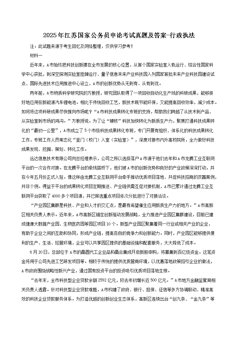 【文档预览】 无忧考网整理发布2025年江苏国家公务员申论考试真题及答案-行政执法(Word版),前五页预览如下: