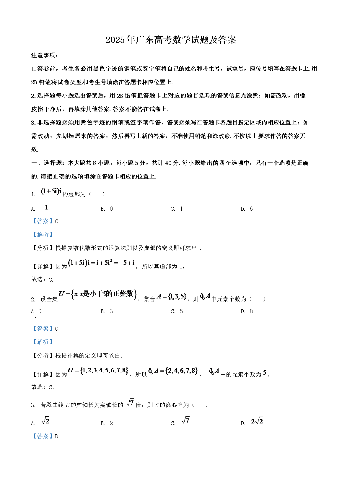 【文档名称】 2025年广东高考数学试题及答案(Word版).doc