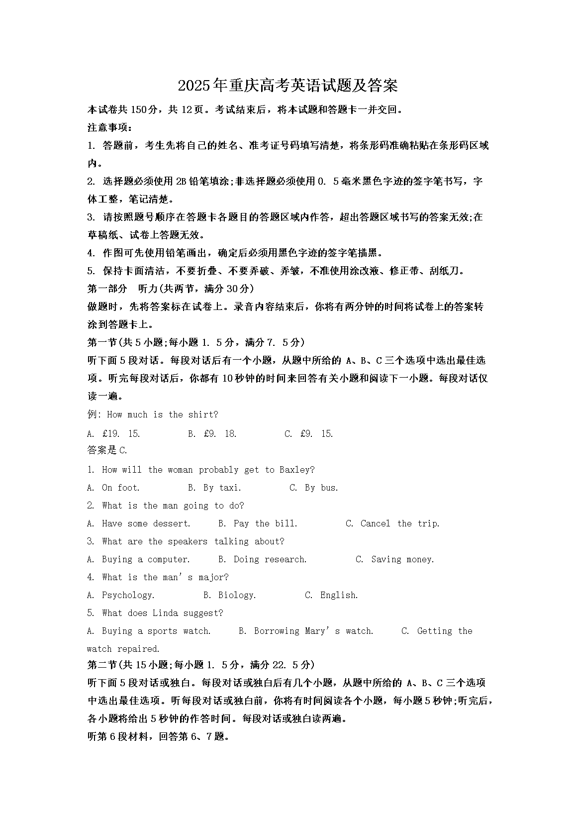【文档名称】 2025年重庆高考英语试题及答案(Word版).doc