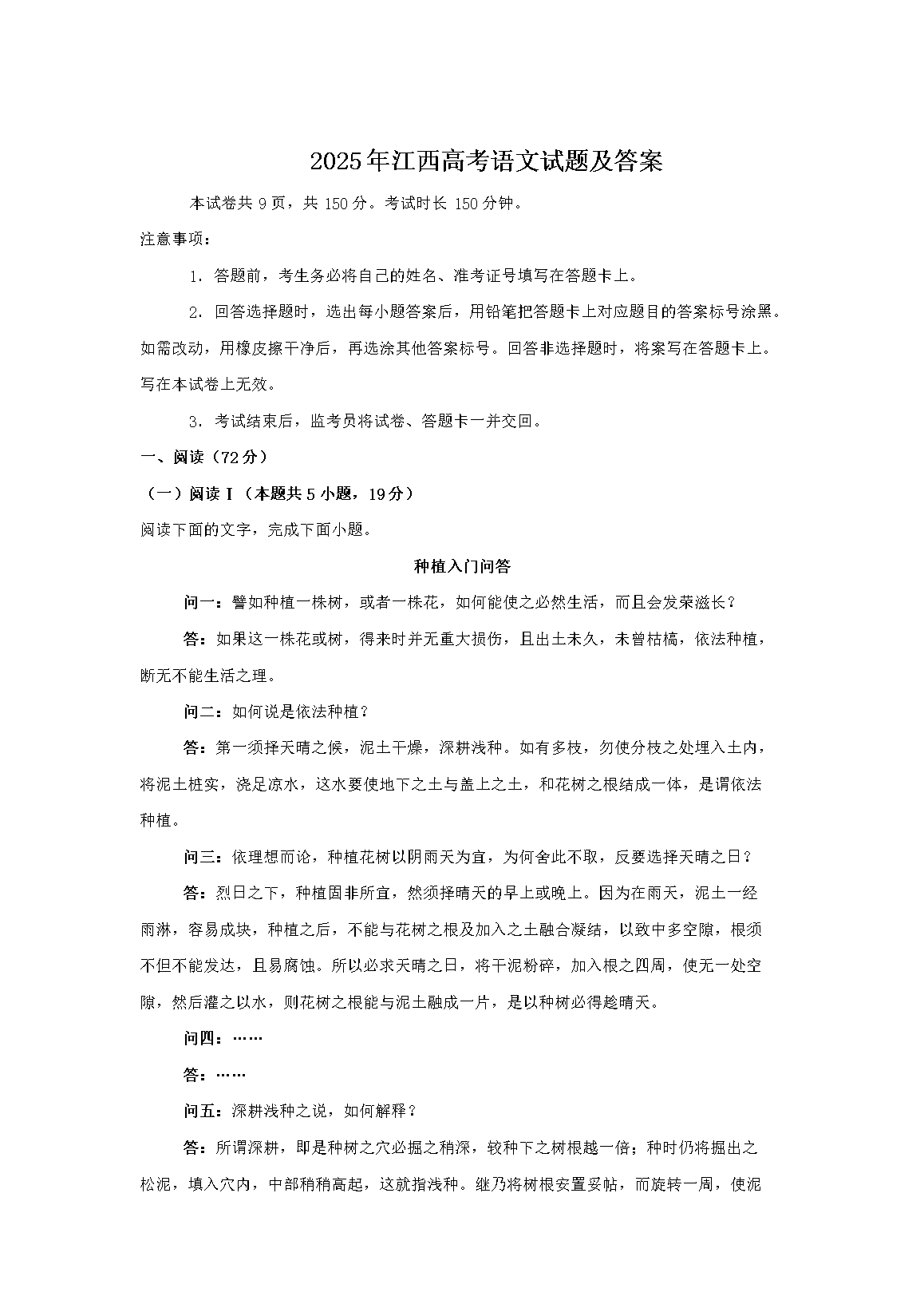 【文档预览】 无忧考网整理发布2025年江西高考语文试题及答案(Word版),前五页预览如下: