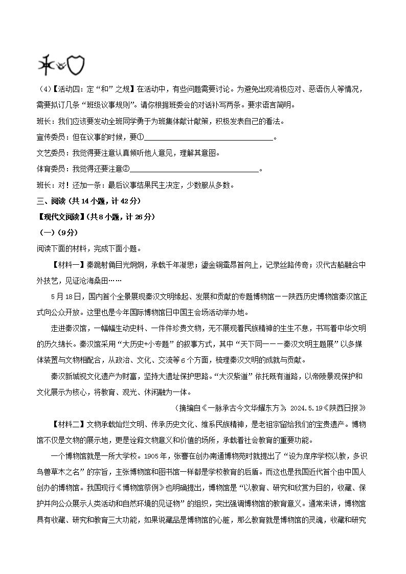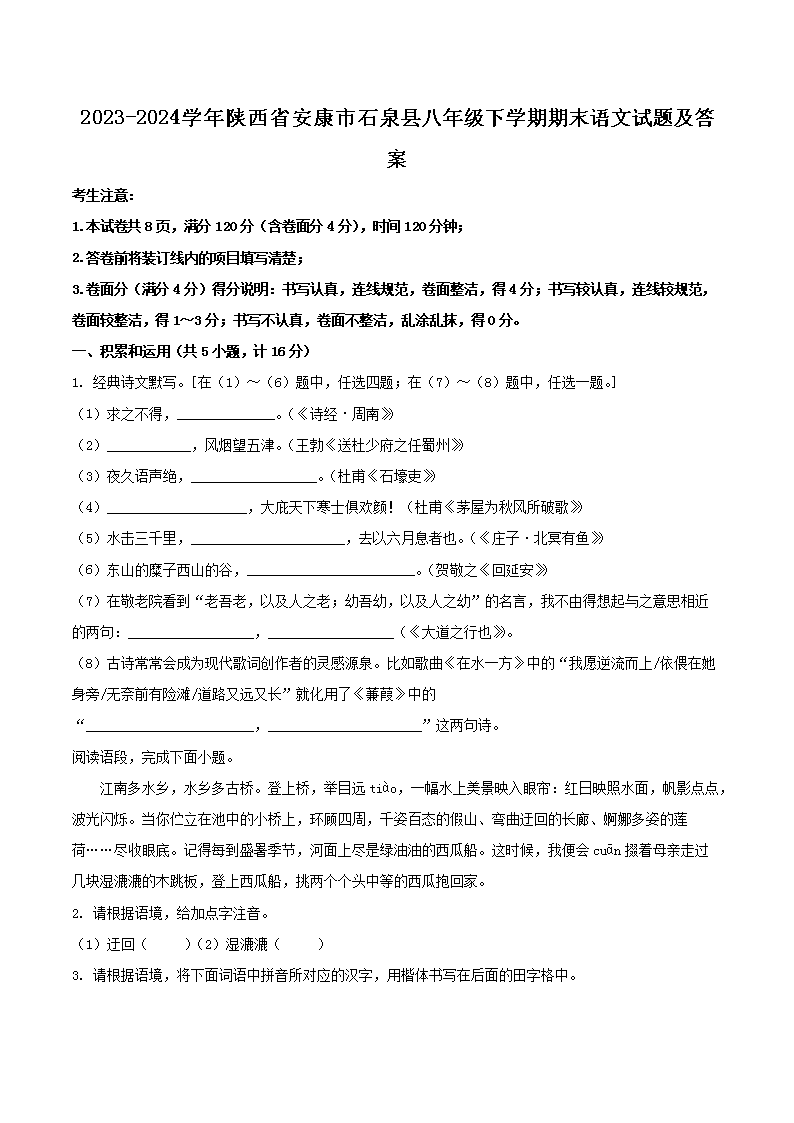 【文档名称】 2023-2024学年陕西省安康市石泉县八年级下学期期末语文试题及答案(Word版).doc