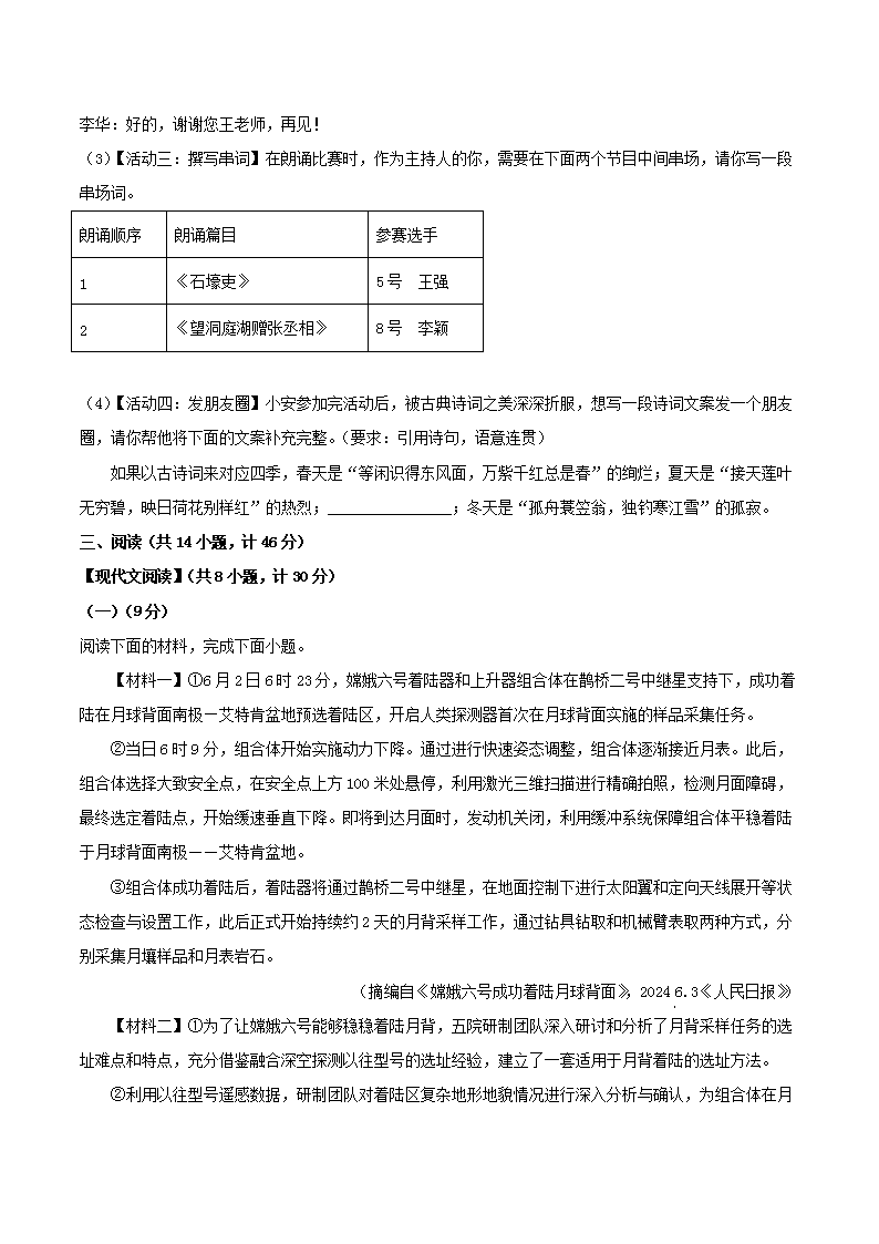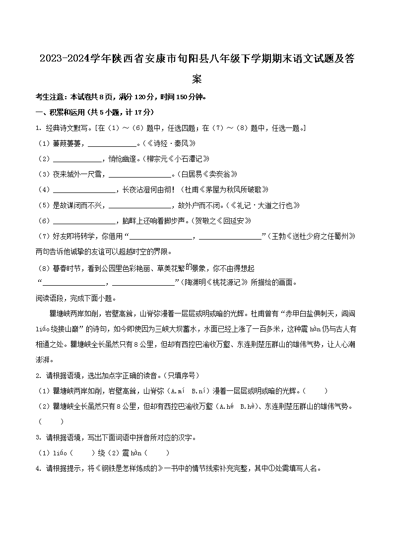 【文档名称】 2023-2024学年陕西省安康市旬阳县八年级下学期期末语文试题及答案(Word版).doc