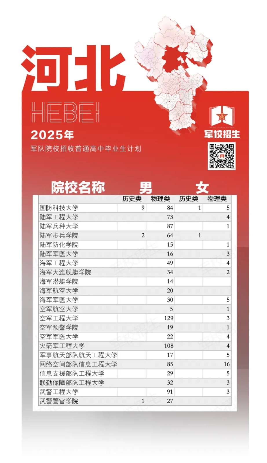 【#高考# #河北2025年军队院校普通高中毕业生招生计划公布#】®无忧考网根据军校招生公众号发布的《2025年军队院校招收普通高中毕业生计划》了解到,河北2025年军队院校普通高中毕业生招生计划已公布,具体如下: