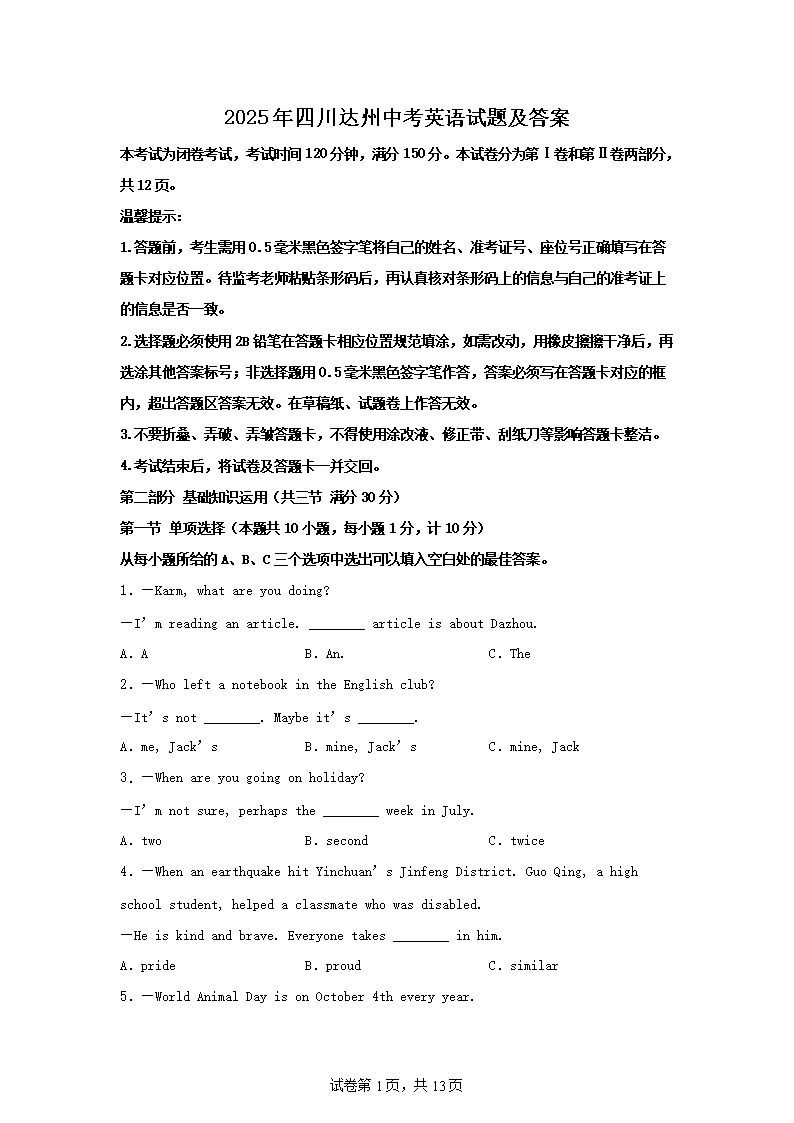 【文档名称】 2025年四川达州中考英语试题及答案(Word版).doc