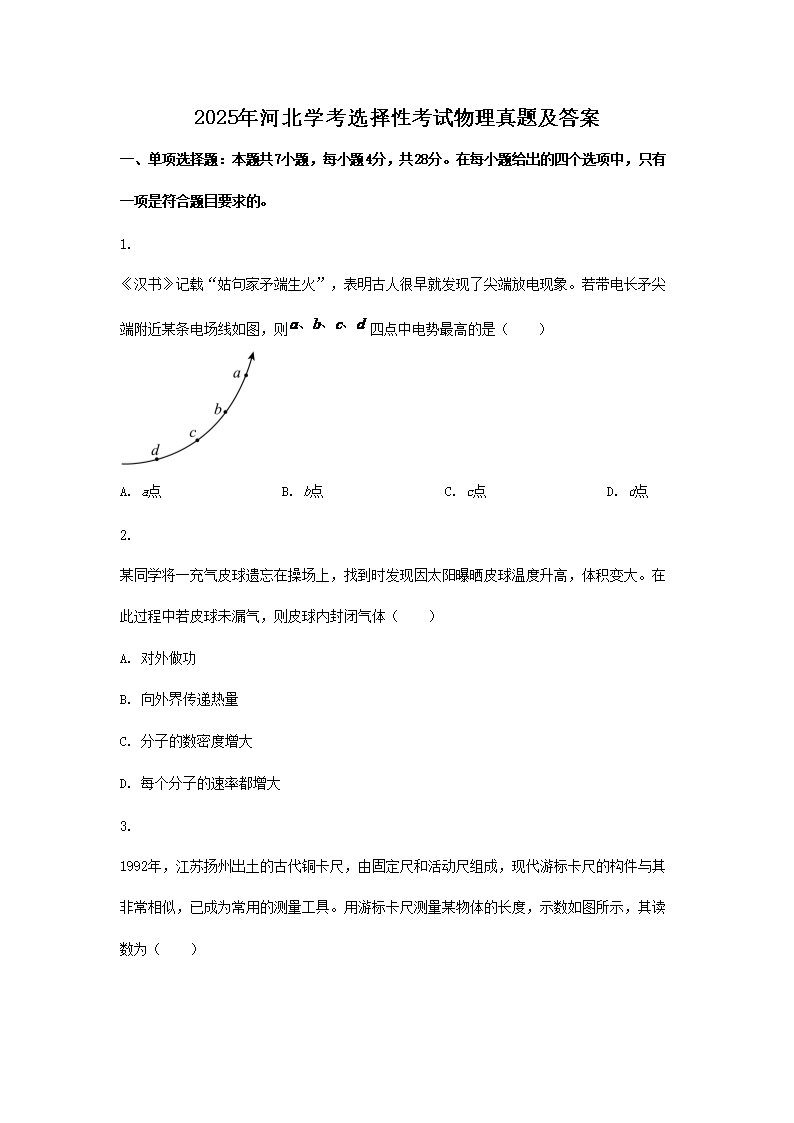 【文档预览】 无忧考网整理发布2025年河北学考选择性考试物理真题及答案(Word版),前五页预览如下: