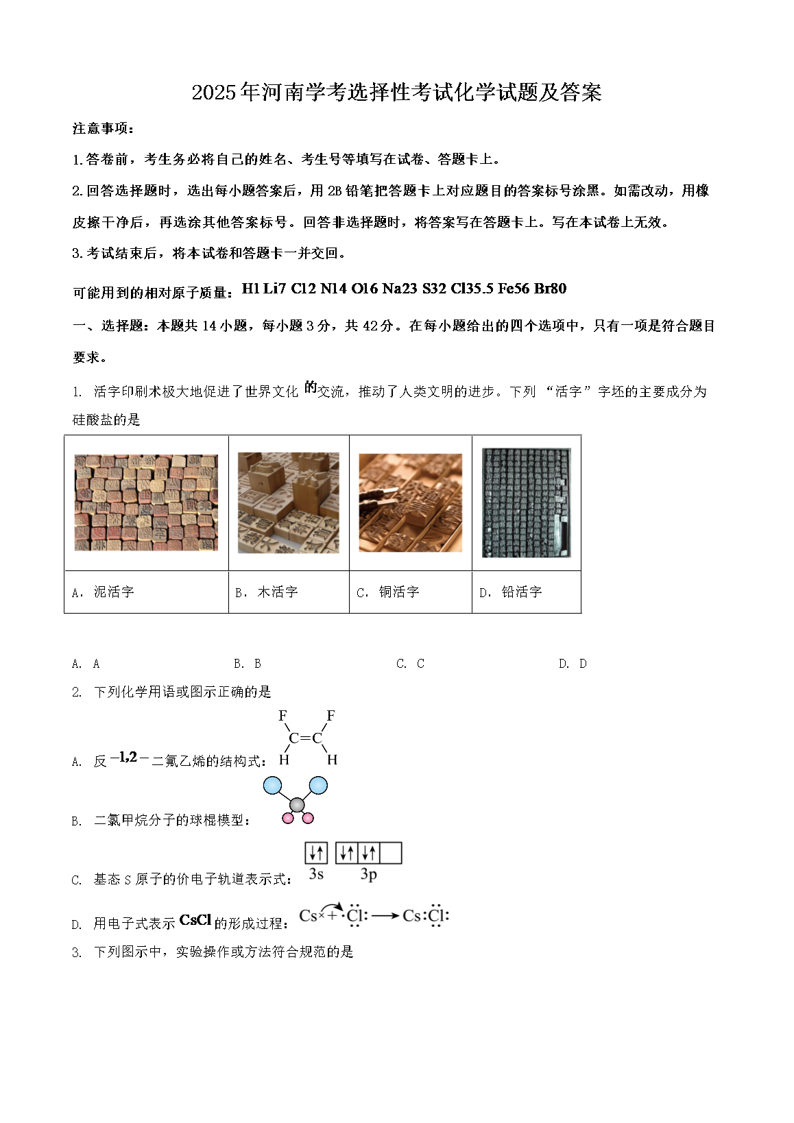 【文档名称】 2025年河南学考选择性考试化学试题及答案(Word版).doc