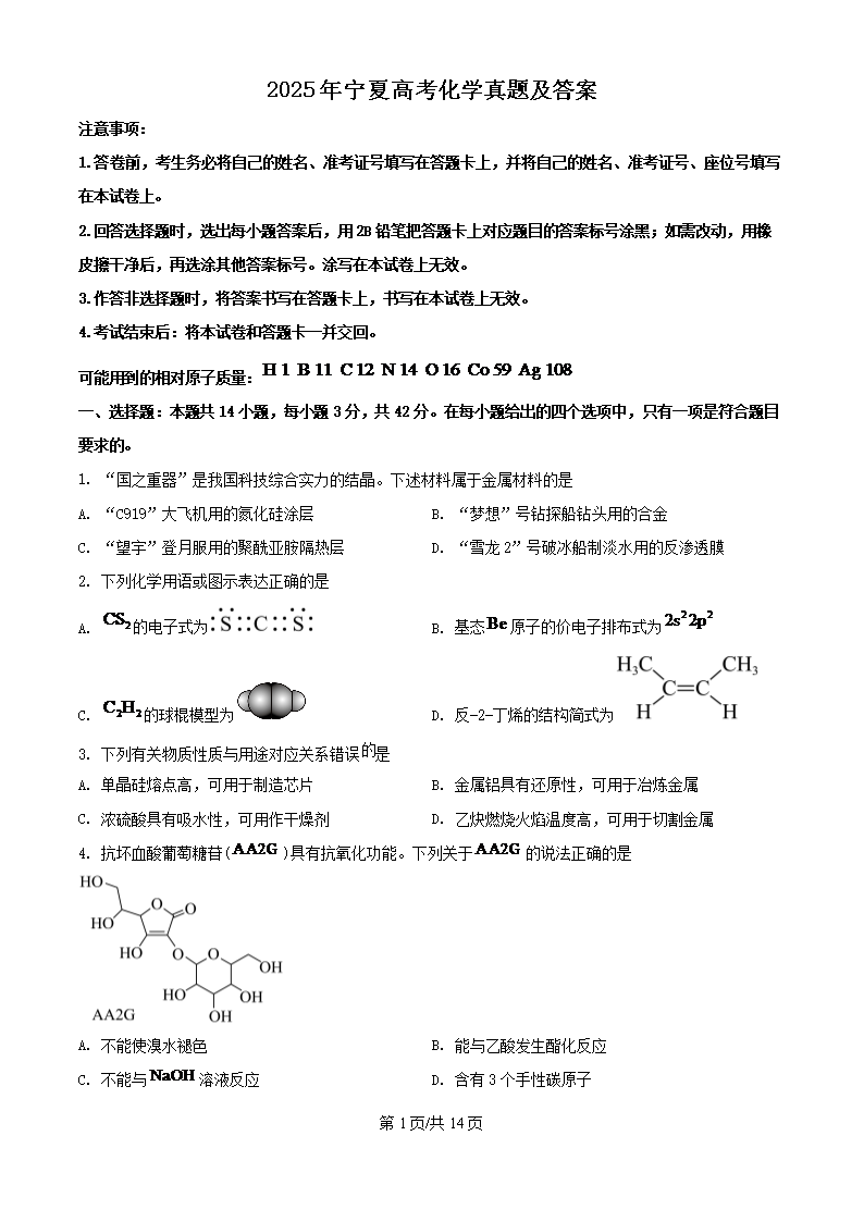 【文档预览】 无忧考网整理发布2025年宁夏高考化学真题及答案(Word版),前五页预览如下: