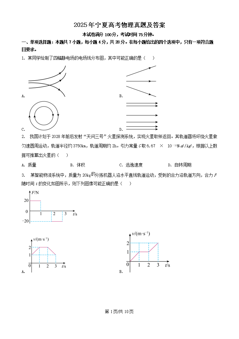 【文档预览】 无忧考网整理发布2025年宁夏高考物理真题及答案(Word版),前五页预览如下: