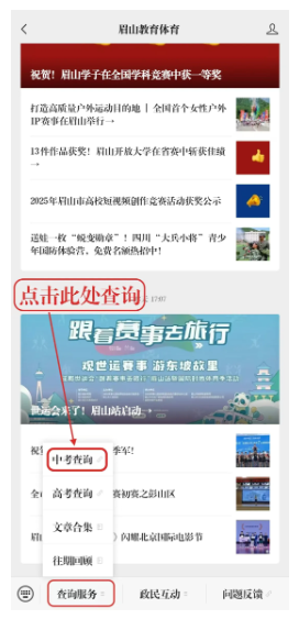 一、进入“眉山教育体育”微信公众号,点击左下角的“查询服务”,选择“中考查询”