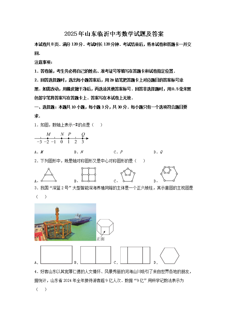 【文档名称】 2025年山东临沂中考数学试题及答案(Word版).doc