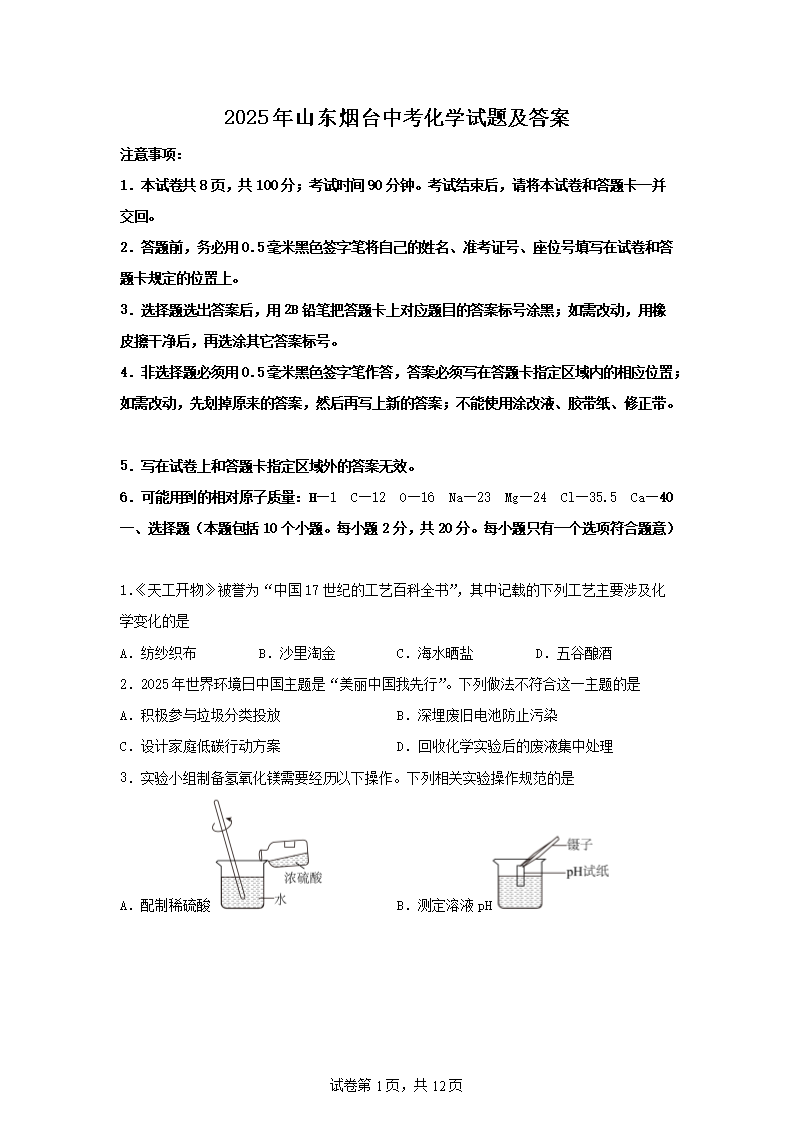 【文档预览】 无忧考网整理发布2025年山东烟台中考化学试题及答案(Word版),前五页预览如下: