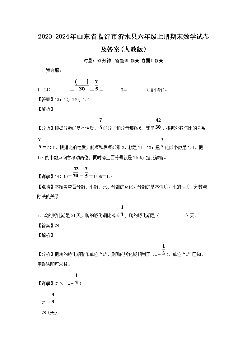 【文档名称】 2023-2024年山东省临沂市沂水县六年级上册期末数学试卷及答案(人教版)(Word版).doc