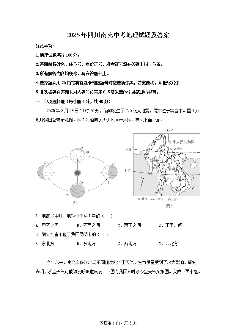【文档名称】 2025年四川南充中考地理试题及答案(Word版).doc