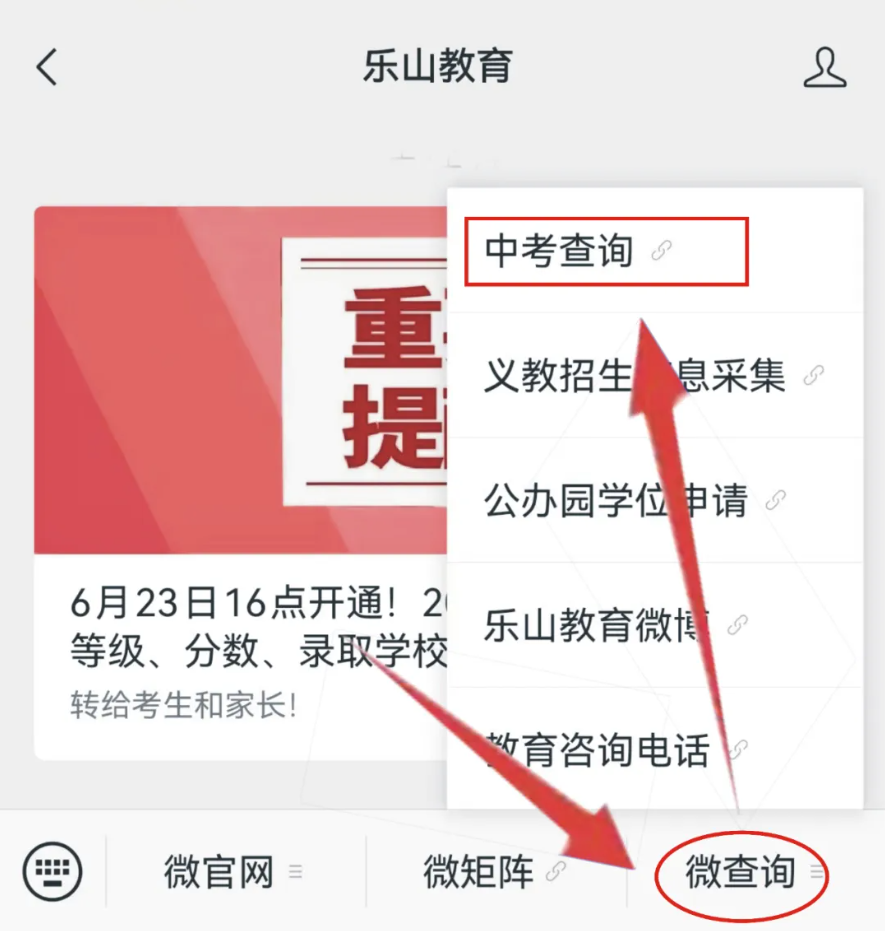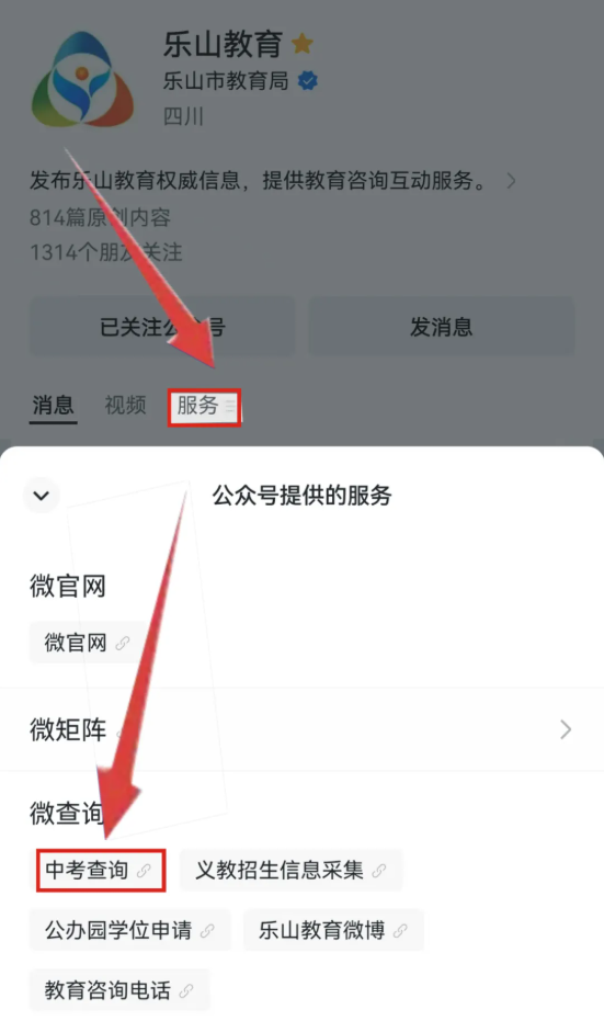 新关注用户:微信公众号新关注用户,点击”乐山教育“微信公众号图标下面的”服务“栏目,再点击“中考查询”进入。
