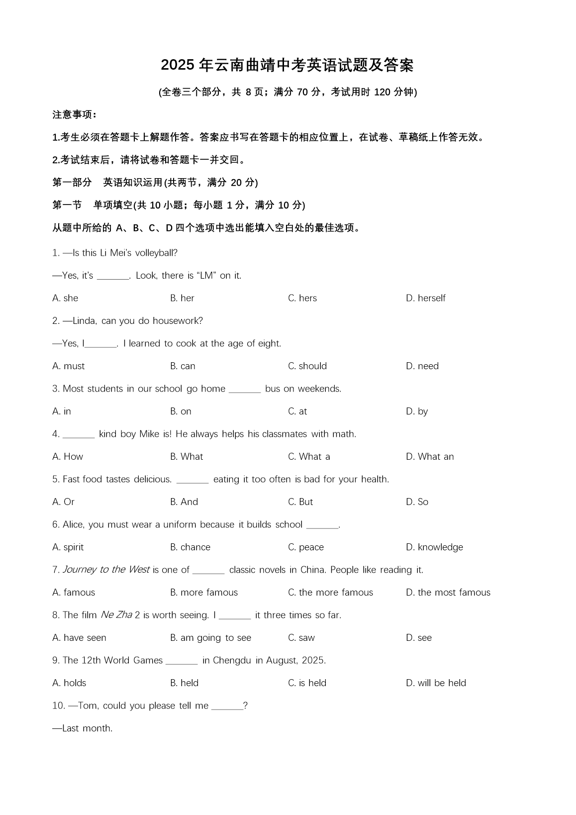 【文档名称】 2025年云南曲靖中考英语试题及答案(Word版).doc