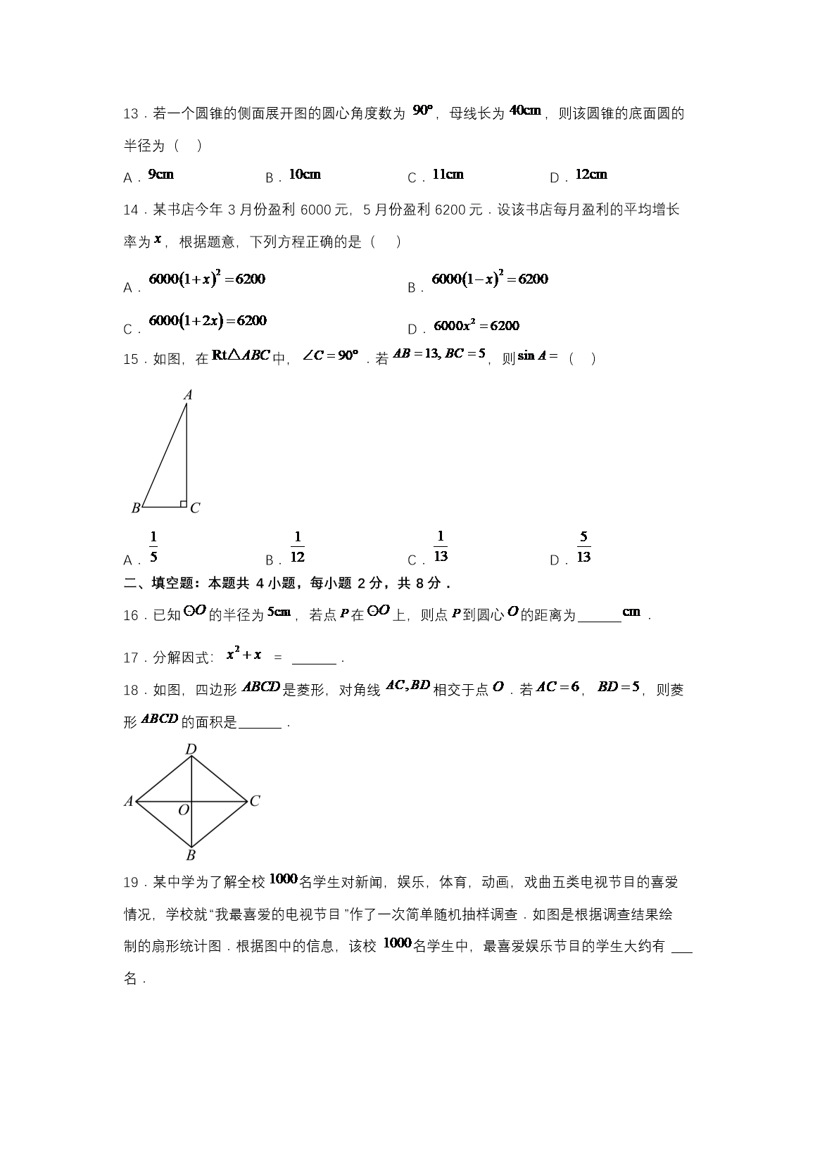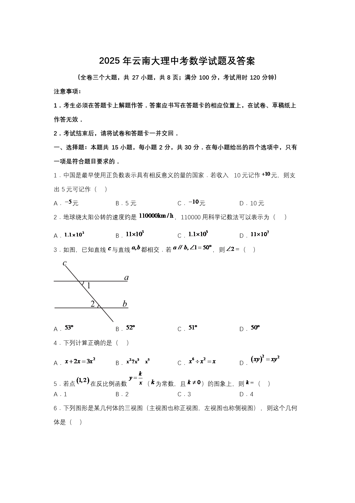 【文档名称】 2025年云南大理中考数学试题及答案(Word版).doc