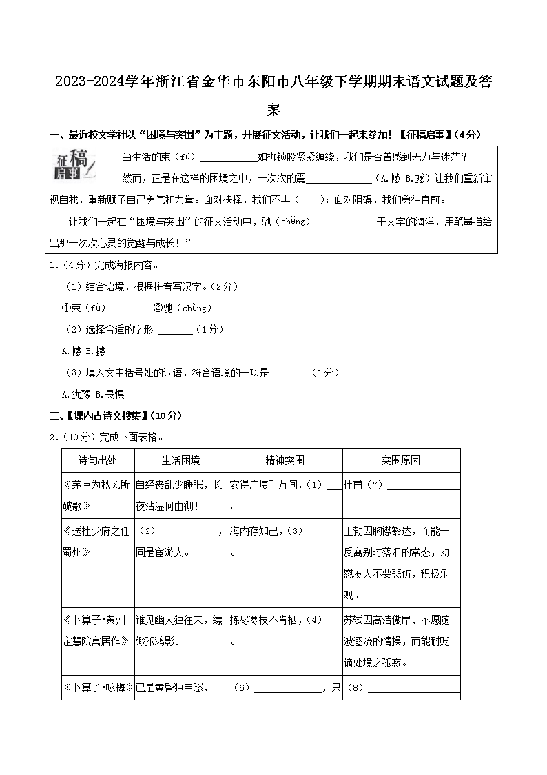【文档名称】 2023-2024学年浙江省金华市东阳市八年级下学期期末语文试题及答案(Word版).doc