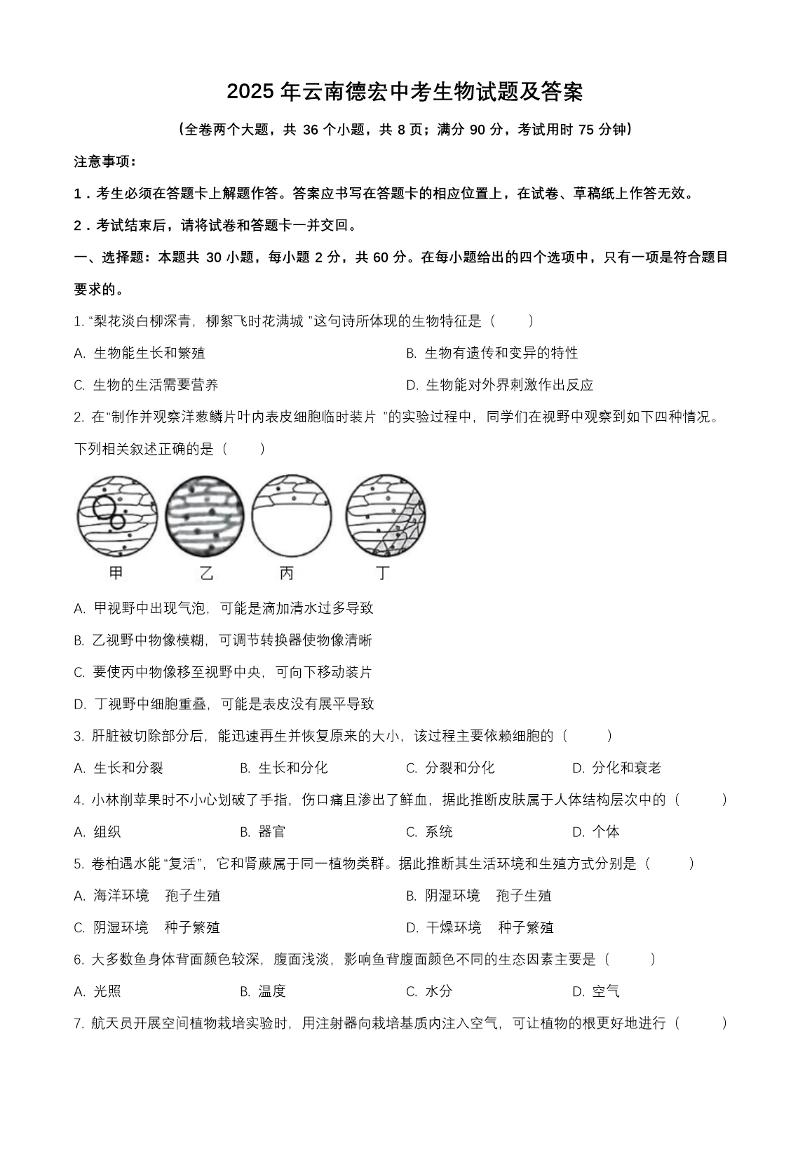 【文档预览】 无忧考网整理发布2025年云南德宏中考生物试题及答案(Word版),前五页预览如下: