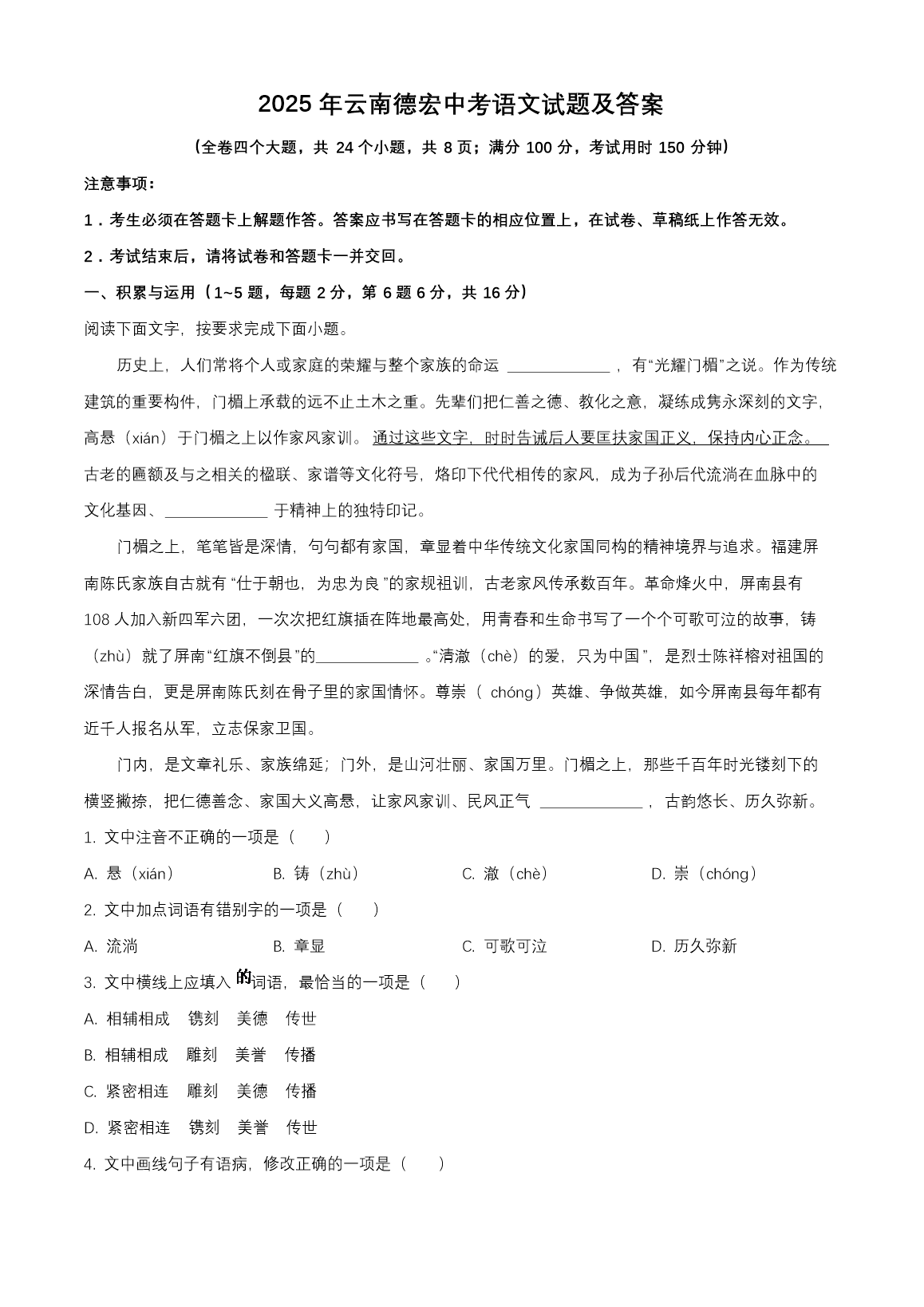 【文档名称】 2025年云南德宏中考语文试题及答案(Word版).doc