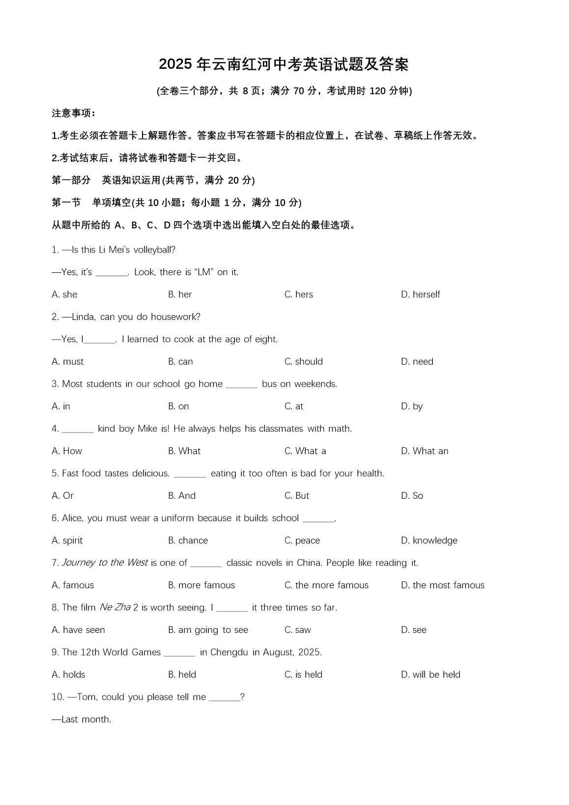 【文档名称】 2025年云南红河中考英语试题及答案(Word版).doc